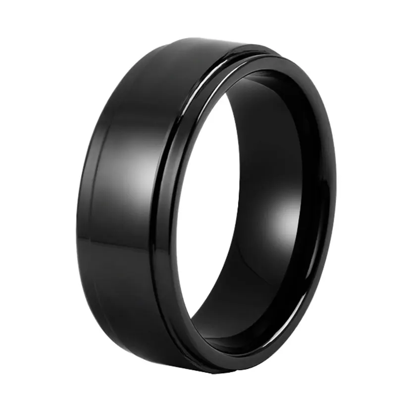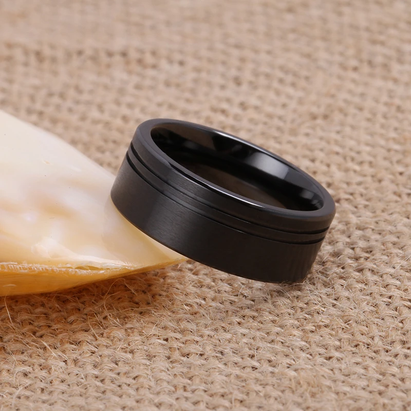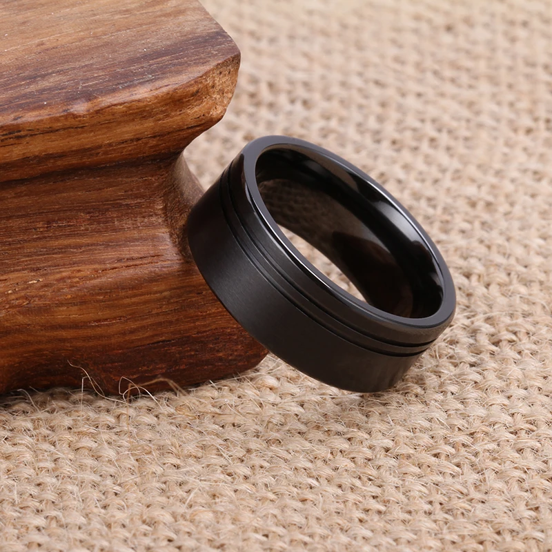 Brushed Flat Black Zirconium Ring 8mm Black Titanium Men Rings Jewelry Two Offset Lines Black Zirconium Men's Ring
