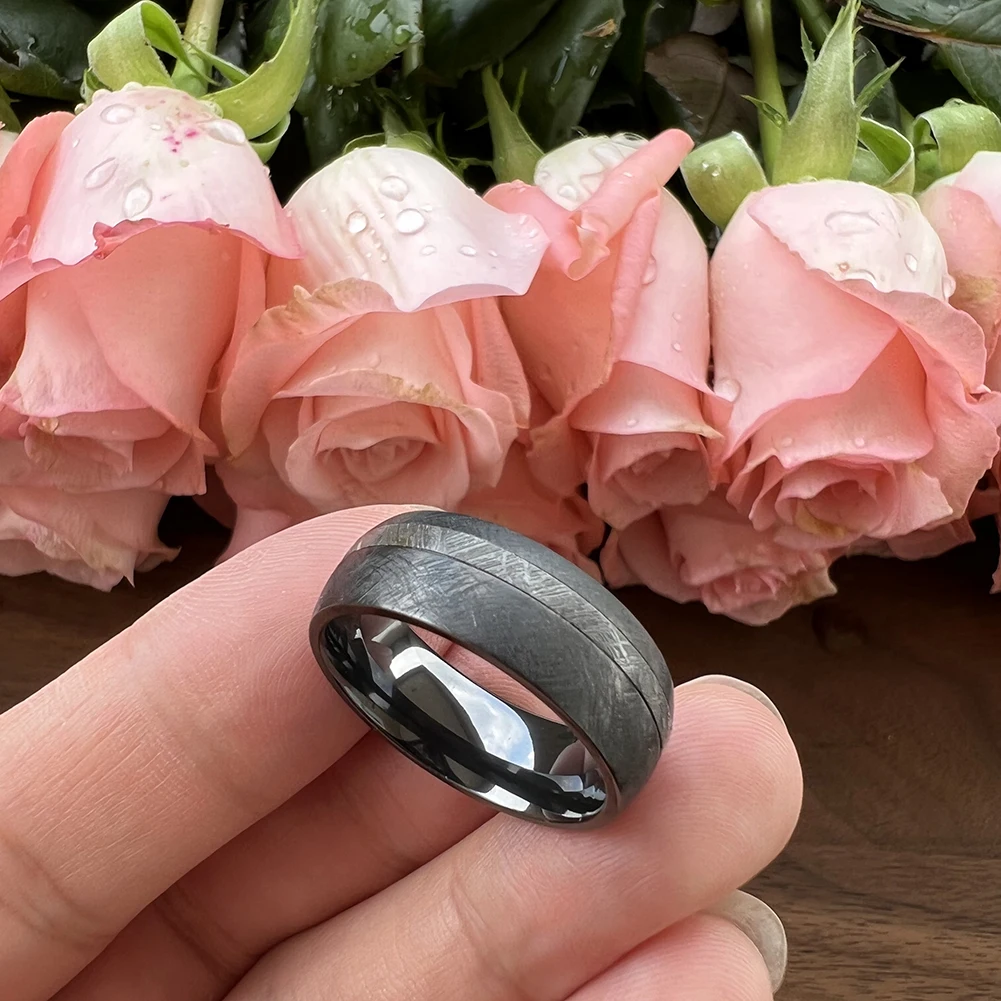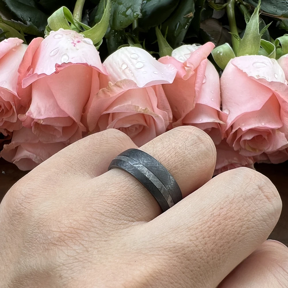 Handmade Mixed Brushed 2mm Meteorite Inlay Black Zirconium Ring