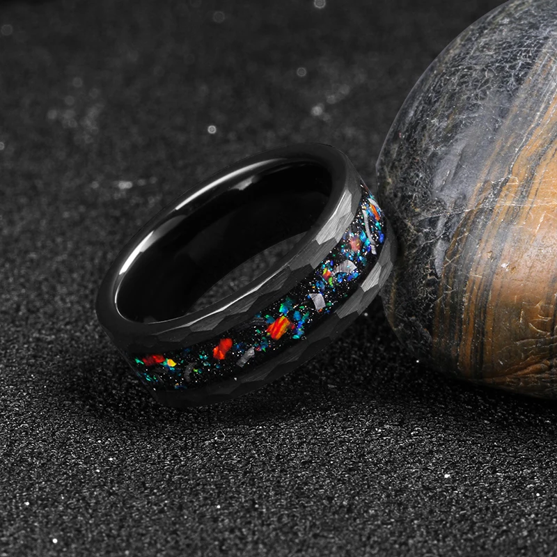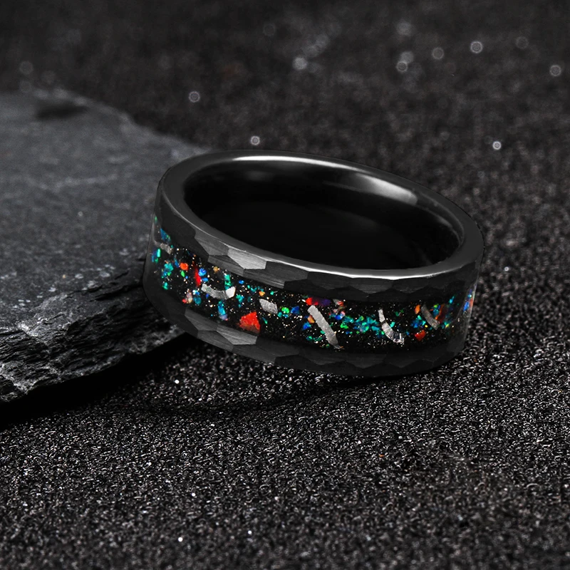 Genuine Meteorite Galaxy Opal Inlay Wedding Bands Matte Finish Comfort Fit 8mm Black Hammered Tungsten Carbide Rings for Men