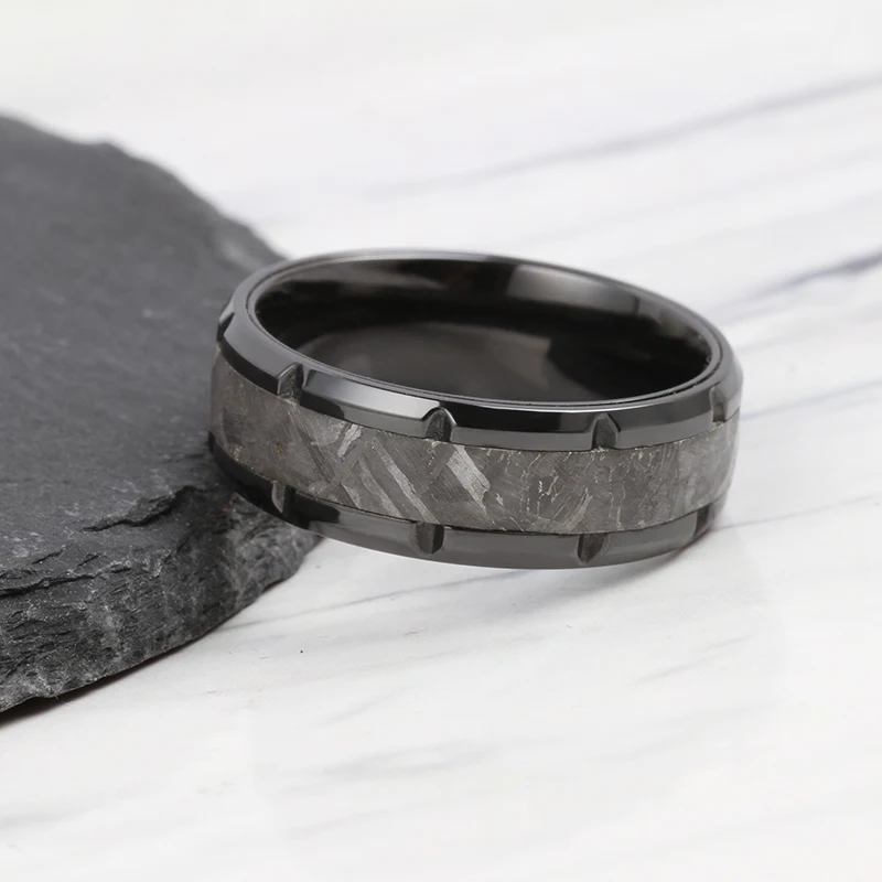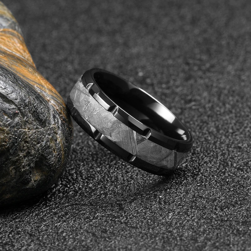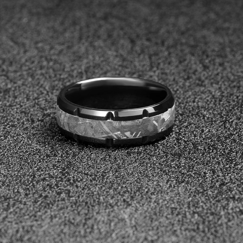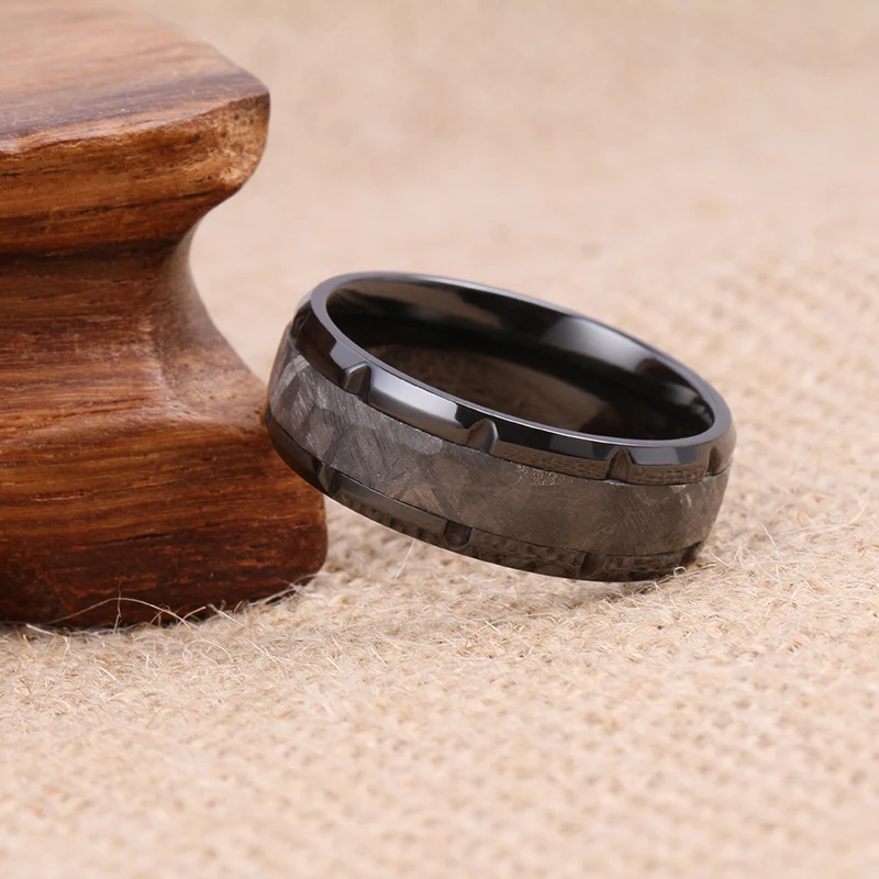 Tizti 8mm Hammered Real Meteorite Black Tungsten Carbide Ring Titanium Wedding Ring Black Zirconium Meteorite Rings for Man