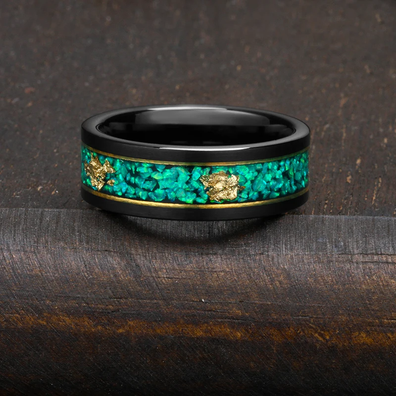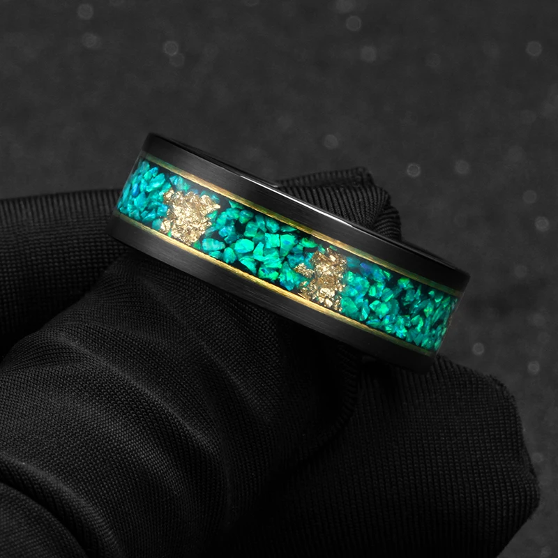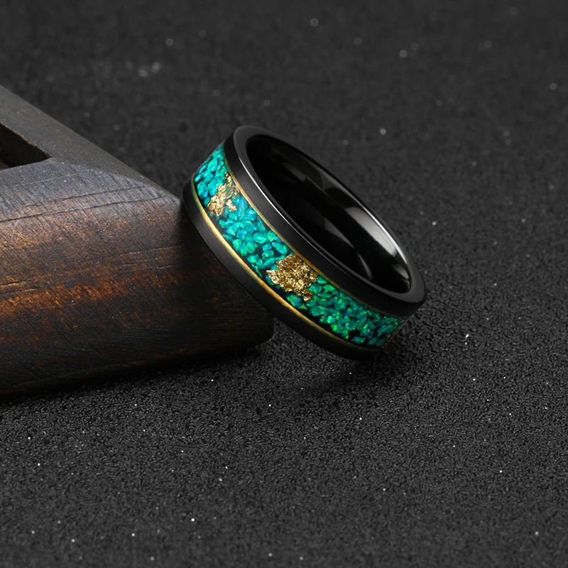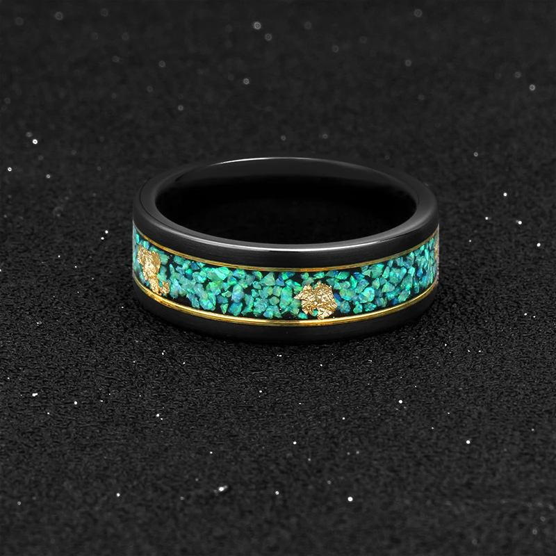 Tizti Jewelry Custom Logo 8mm Green Opal Gold Foils Inlay Tungsten Carbide Wedding Ring for Men Women for Engagement or Gift