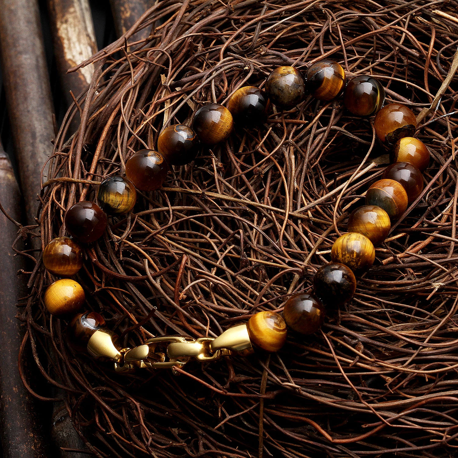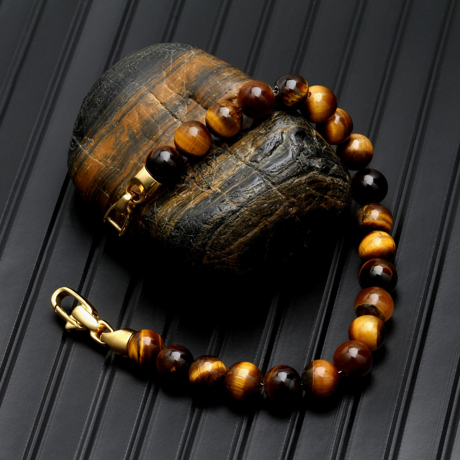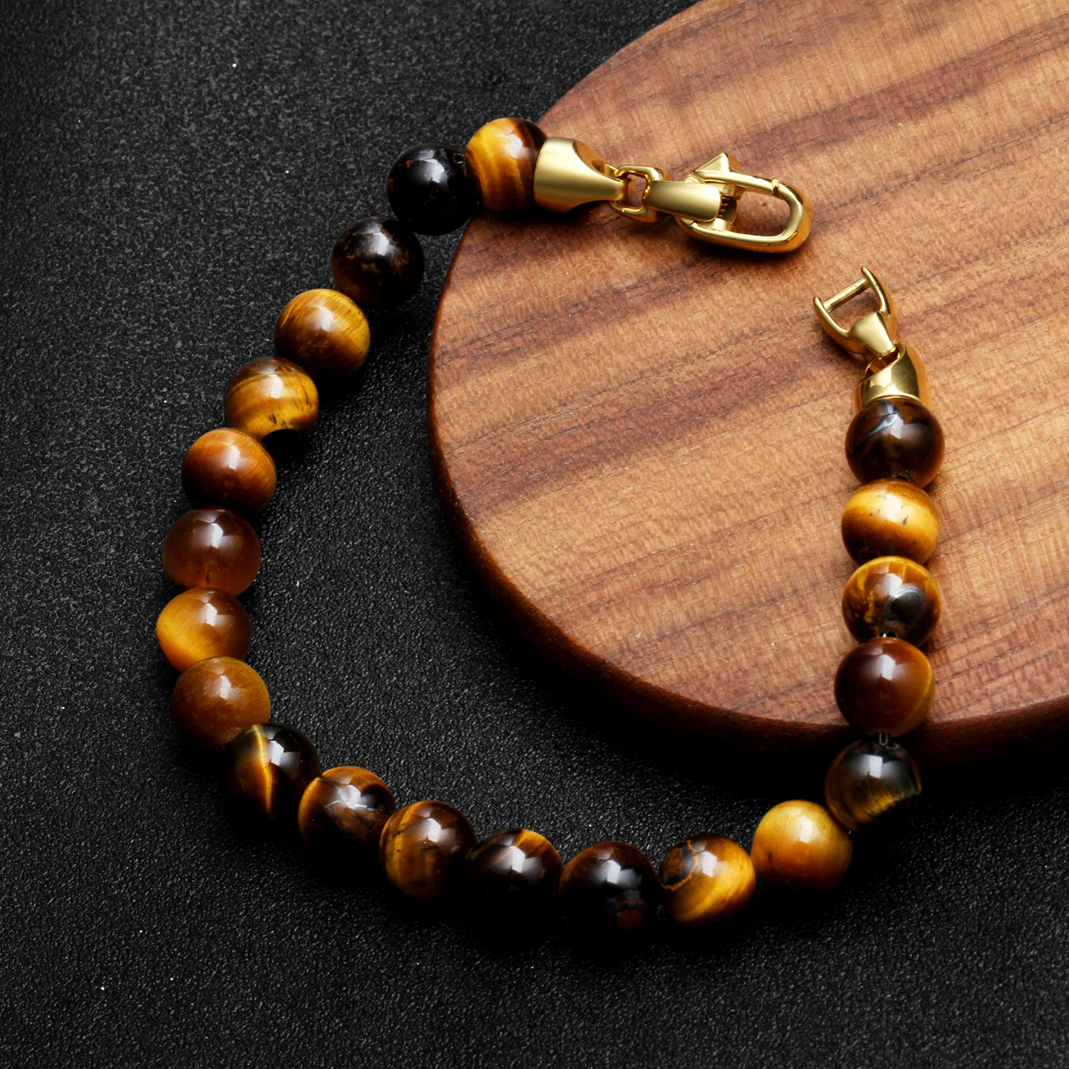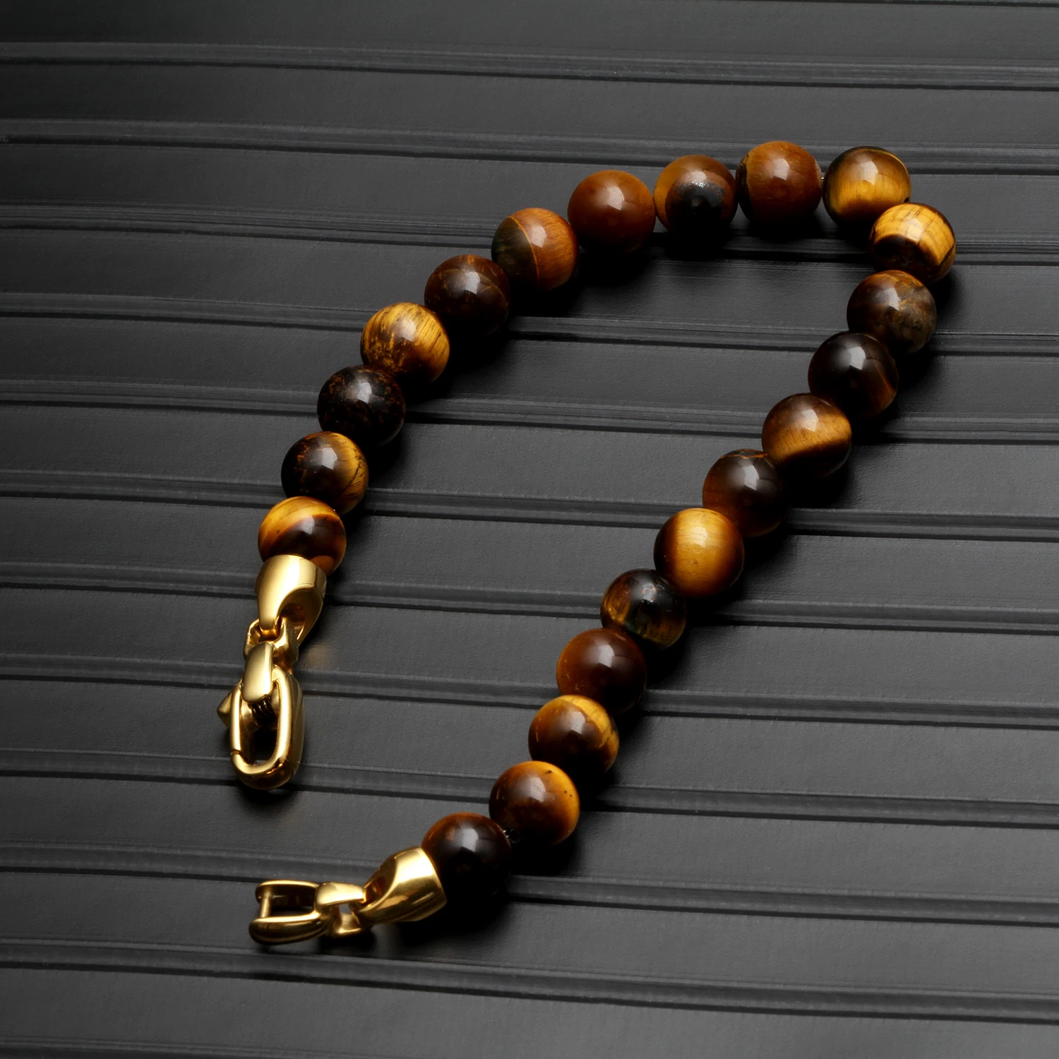 Tizti Trendy 18K Gold Plated Stainless Steel 8MM Tiger Eye Stone Bead Fashion Beaded Bracelet