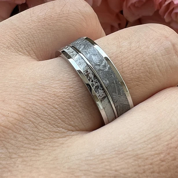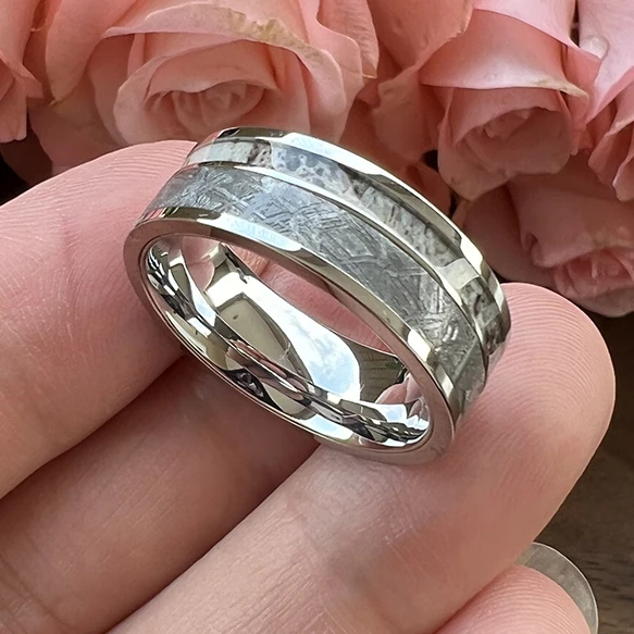 8mm Flat Edge Deer Antler Engagement Men's Meteorite Ring Real Titanium Wedding Band