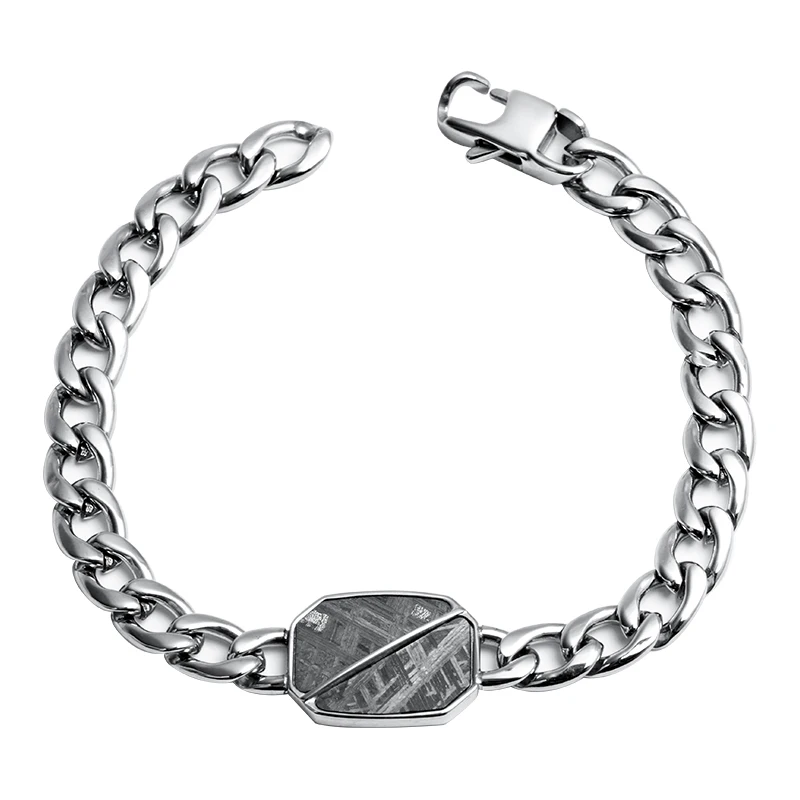 Gold Plated 8mm Vintage Cuban Chain Bracelet Brushed & Polished Two Tone Stainless Steel with Meteorite Inlay