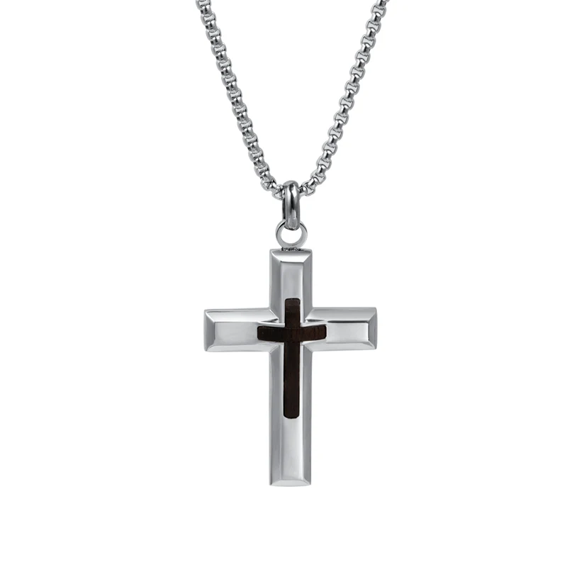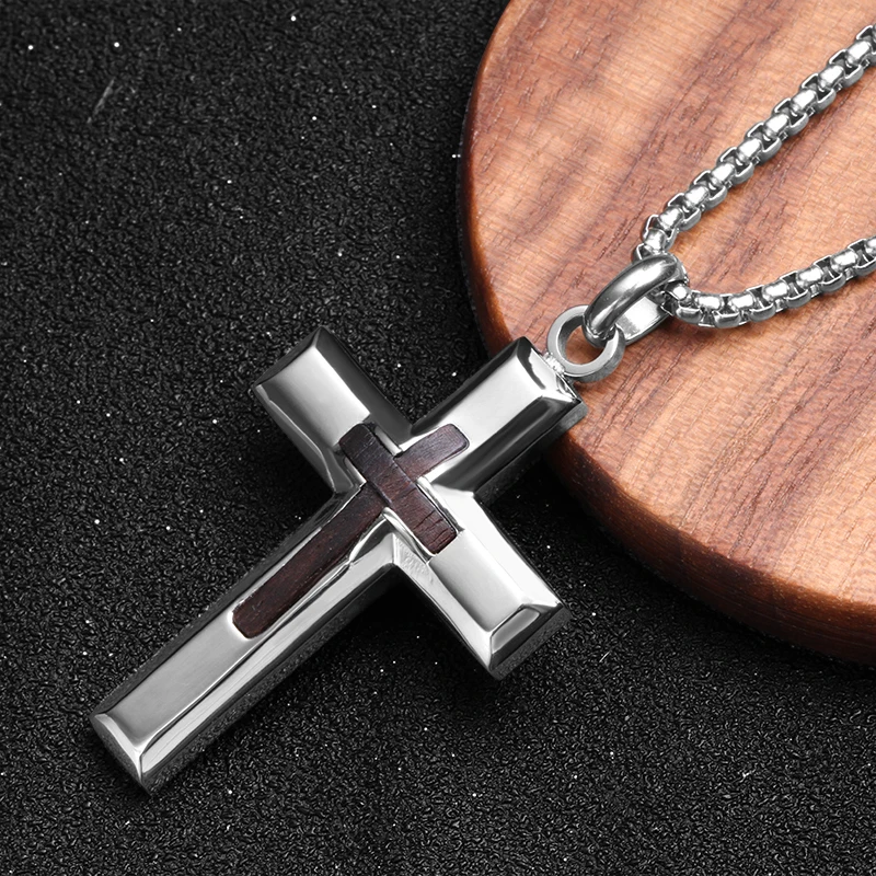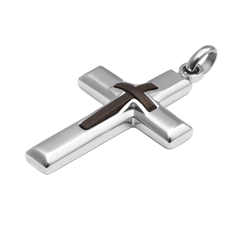 Classic Religious Style Charms Men's Ebony Wooden Pendant with Double Cross Stainless Steel and Customizable Wood Inlay
