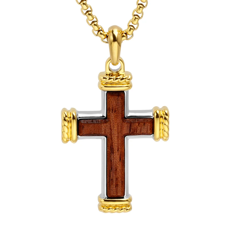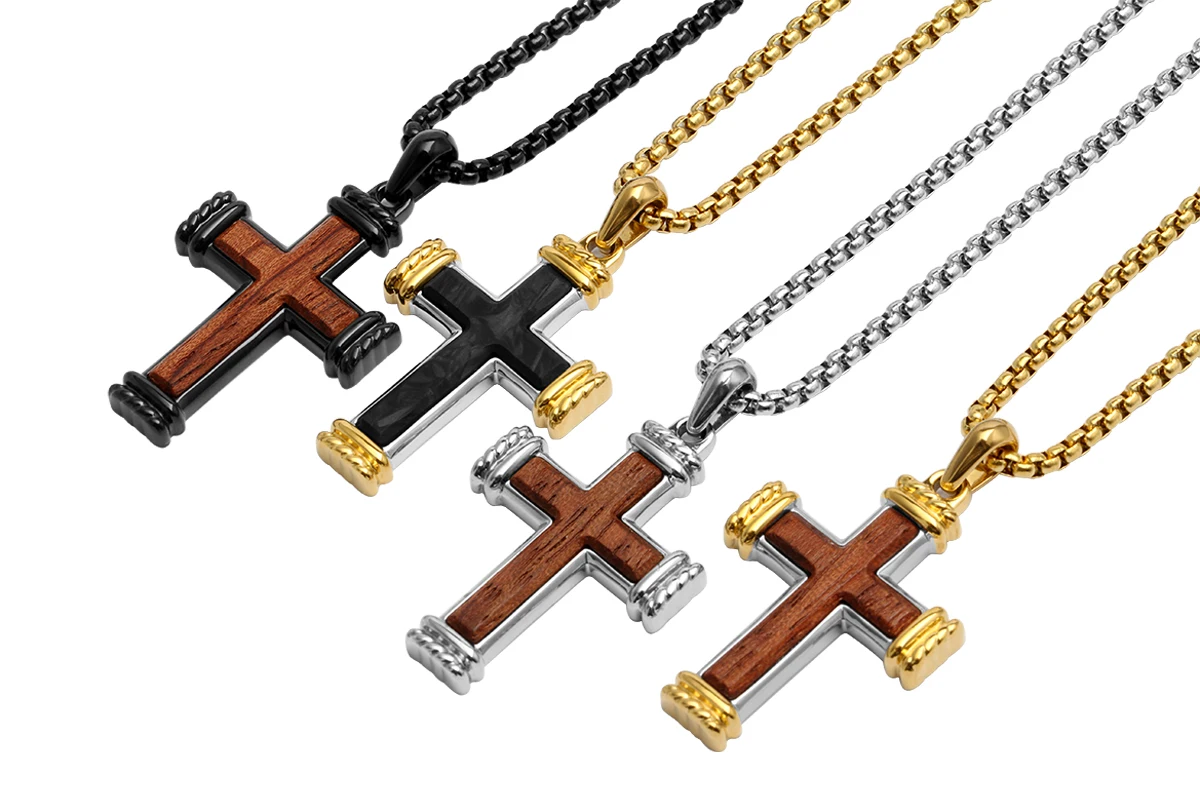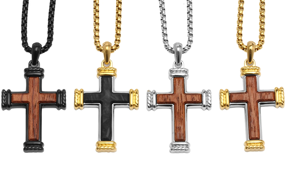 Wooden Cross Necklace for Men Handmade Bubinga Wood Cross Pendant Necklace Stainless Steel Mens Black Wood Cross Pendant