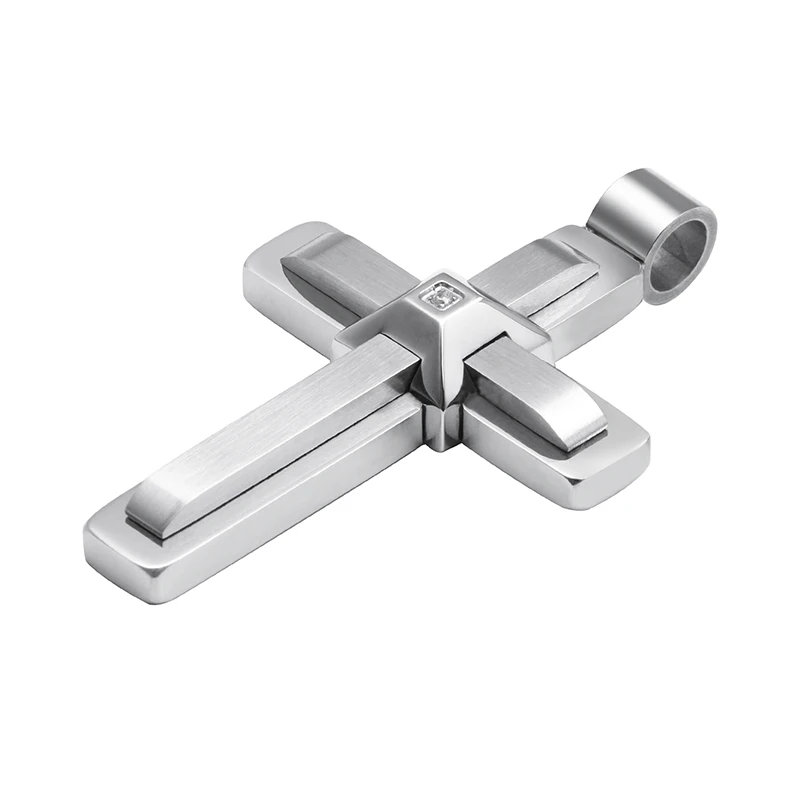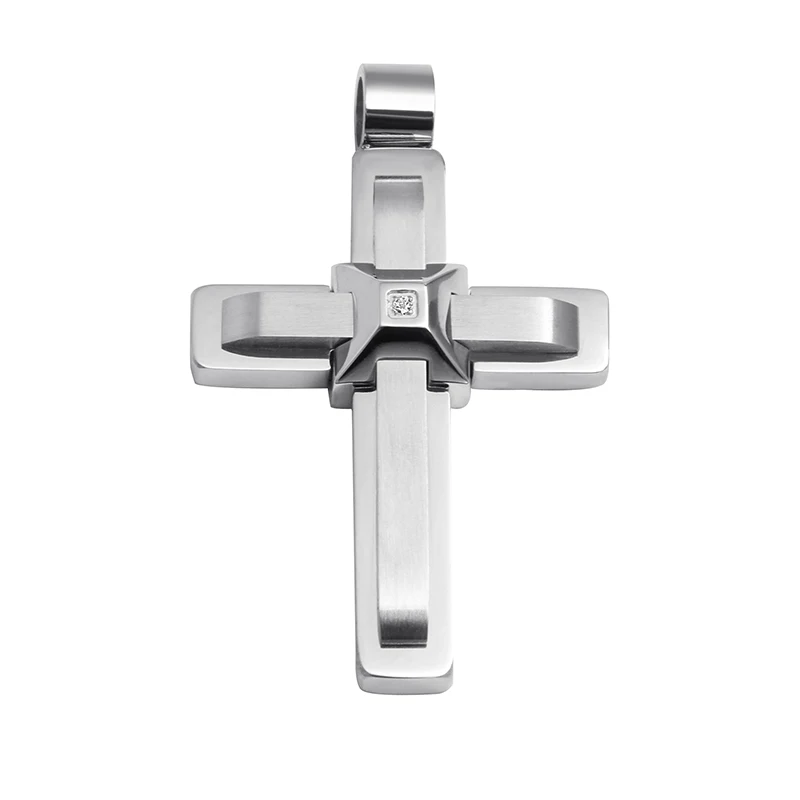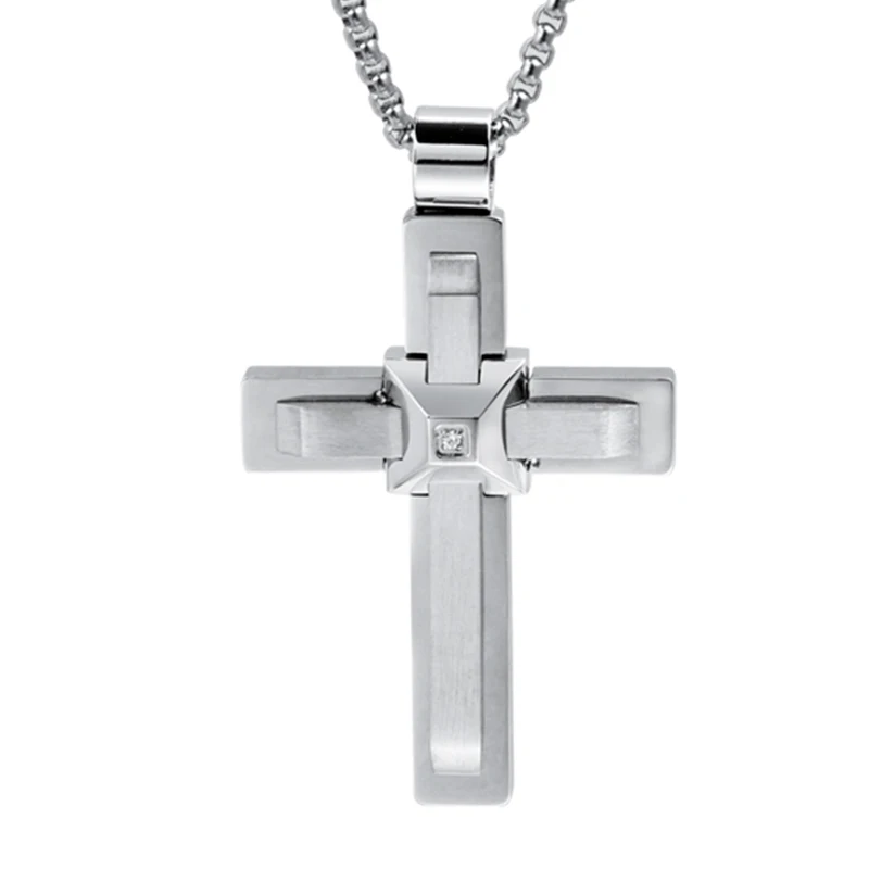 Men's High-Polished 24 Inch Stainless Steel Cross Pendant with White Cubic Zirconia Fashionable Cross Pendant Necklace