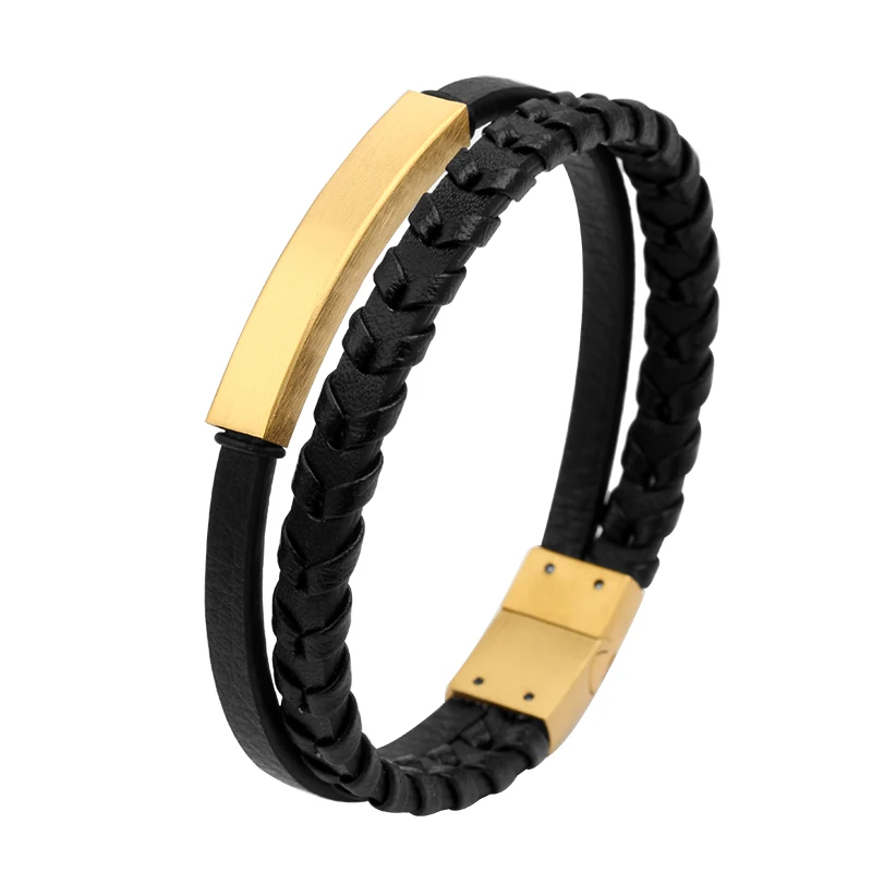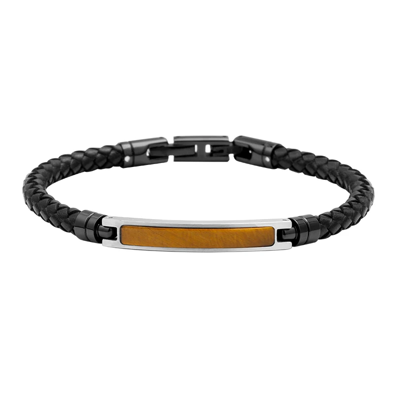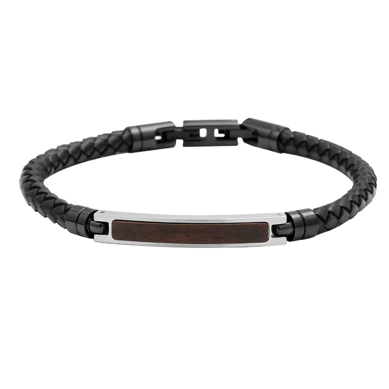 Two Tone 6mm Black Braided Leather Wrap Bracelet with Stainless Steel Ebony Wood Inlay Wooden Stainless Steel Leather Bracelet
