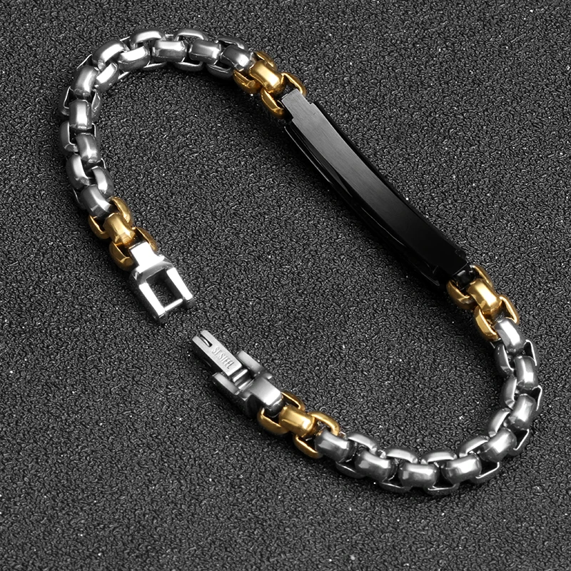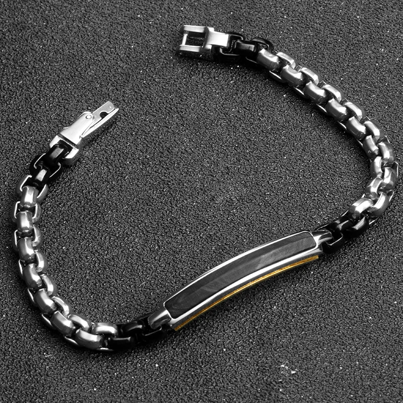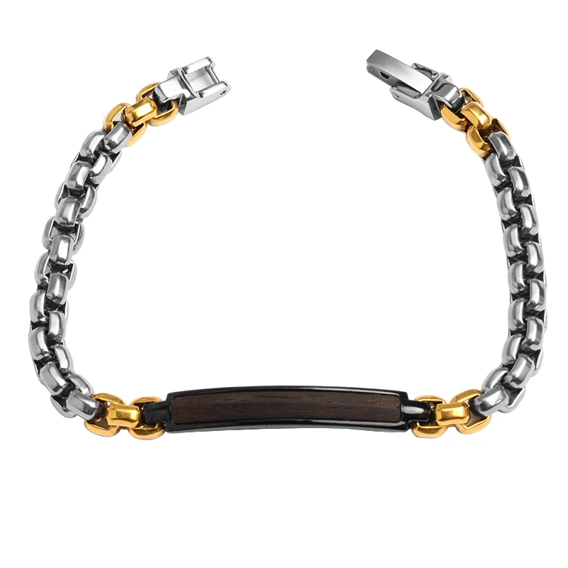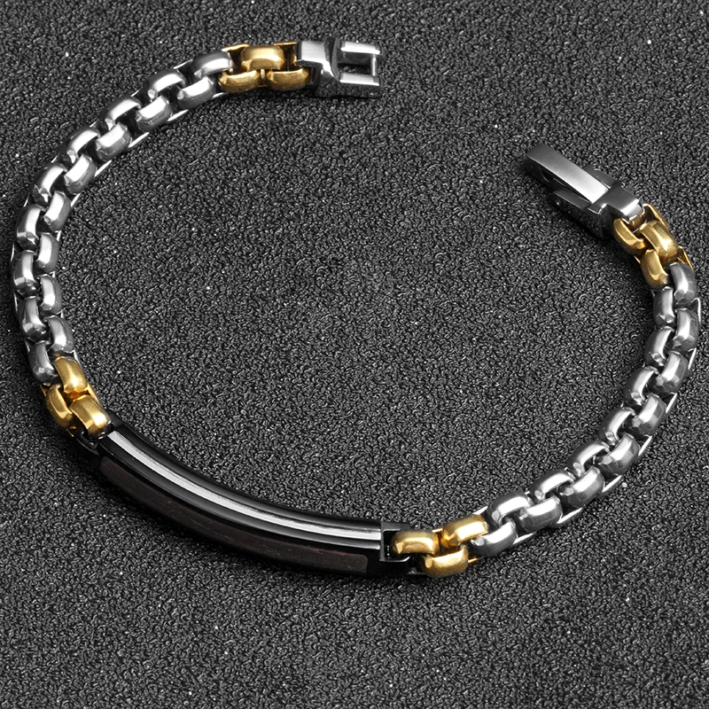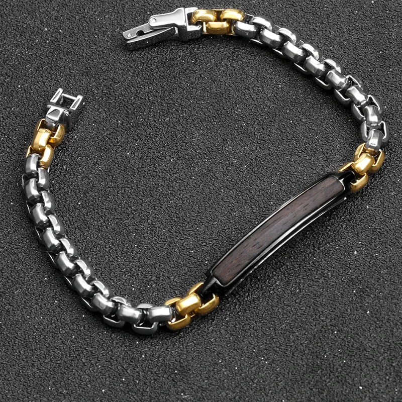 Tizti Wholesale Custom Two Tone Box Chain Stainless Steel Metal Jewelry Wood Inlay Black Bracelet for Men and Women