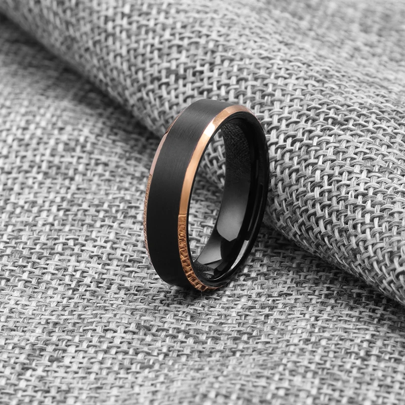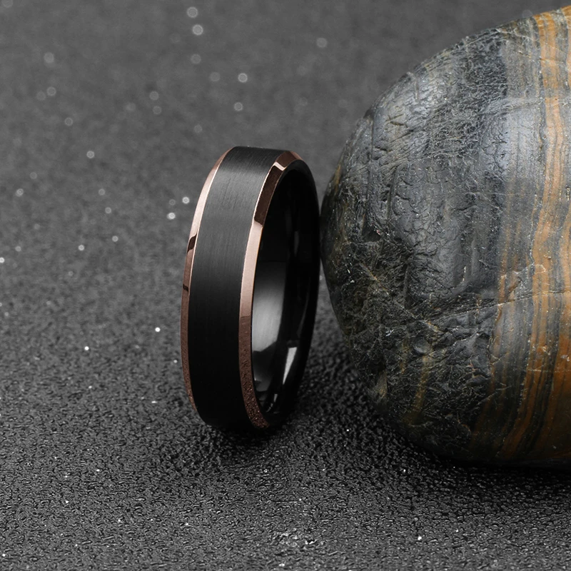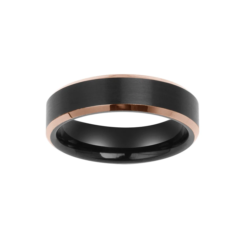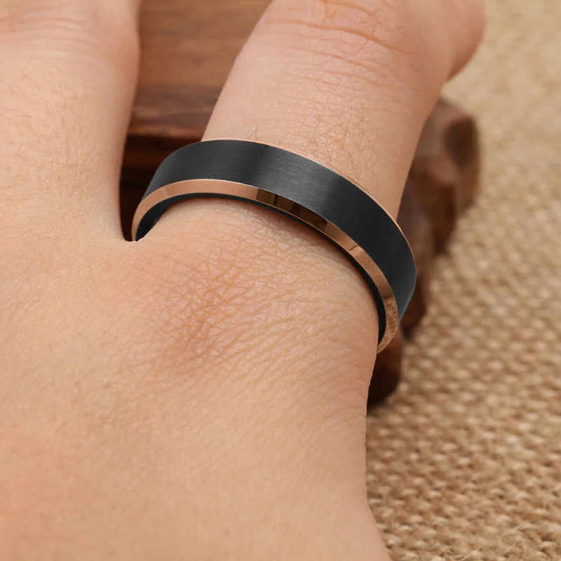 Two Tone 6mm Men's Wedding Band Black Tungsten Ring With 18K Rose Gold Beveled Edges Matte Finish Tungsten Carbide Ring