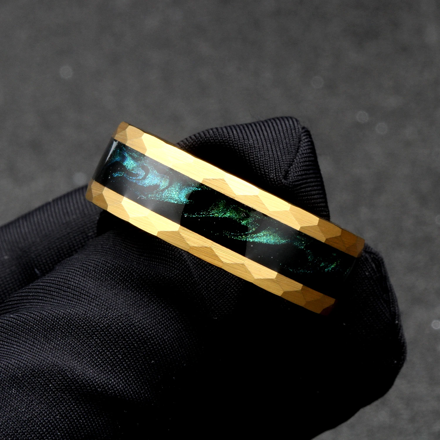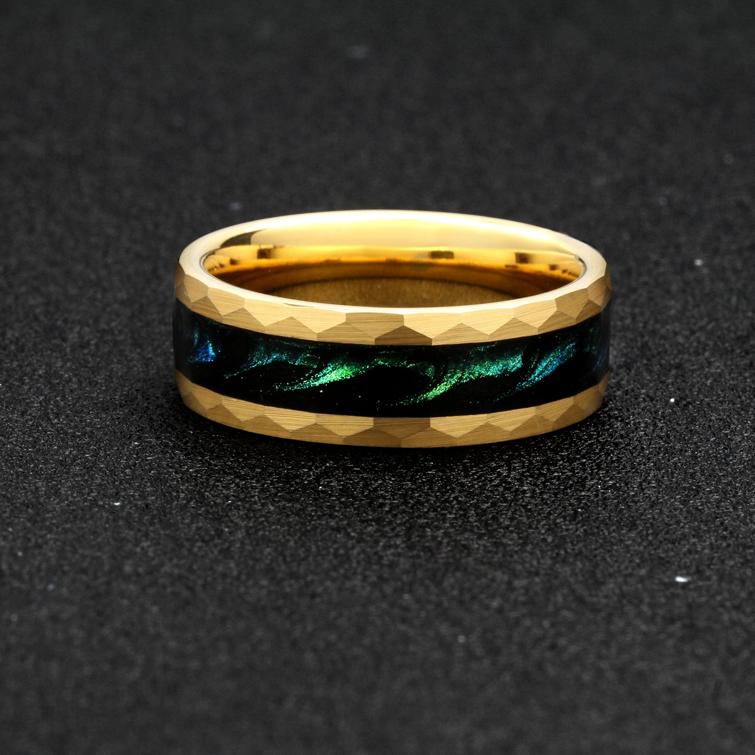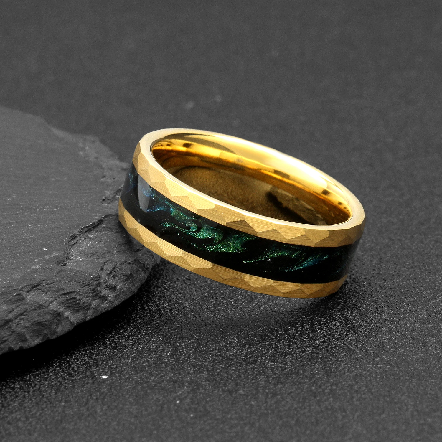 Tizti Jewelry 8mm Matte Brushed Gold Hammered Green Quicksand Tungsten Ring for Men