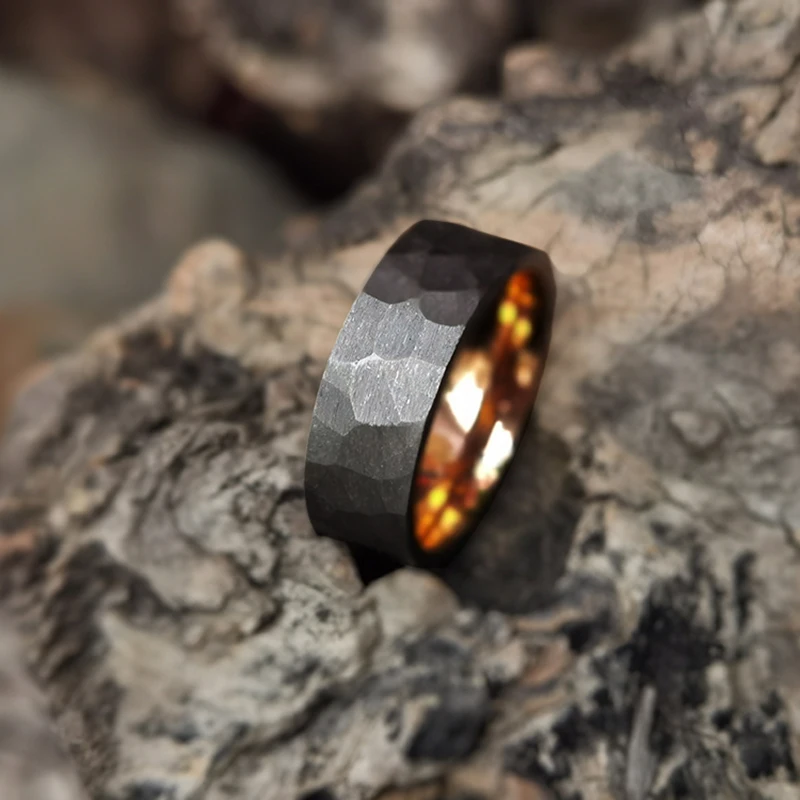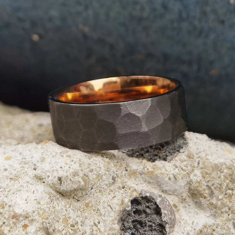 Men's Two Tone 8mm Rose Gold Plated Stainless Steel with Faceted Cut Hammered Grey Pure Tantalum Wedding Band Ring