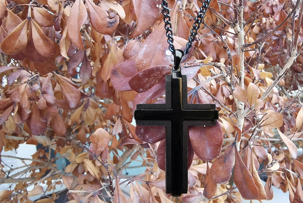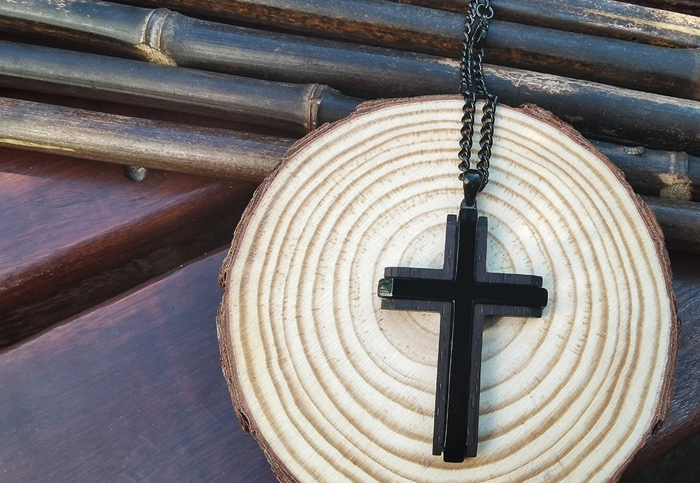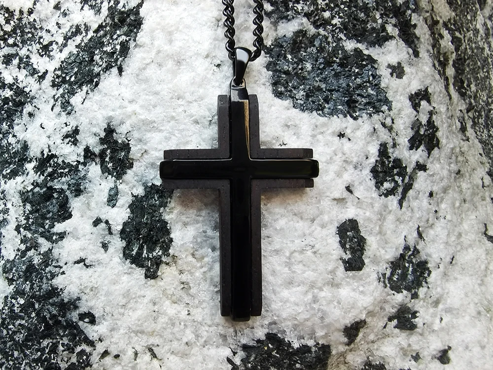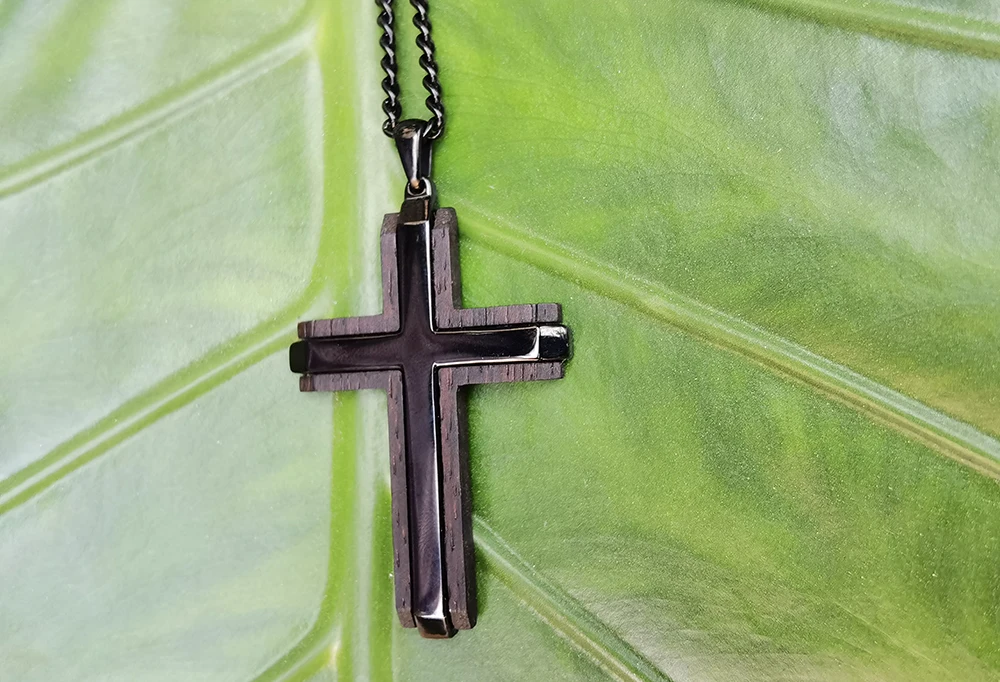 Wholesale 316L Stainless Steel Pendant Necklace for Men Black IP Plated Ebony Wood Inlay Cross Pendant