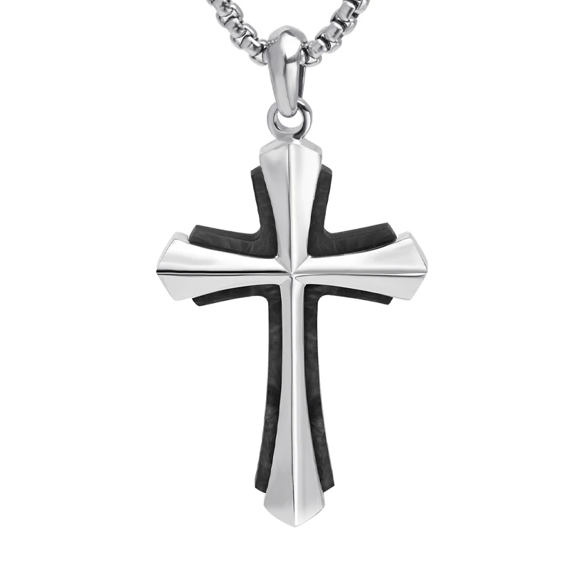 Religious Jewelry Gift for Him Men's Double Cross Pendant Necklace Stainless Steel with Forged Carbon Fiber Cross Pendant