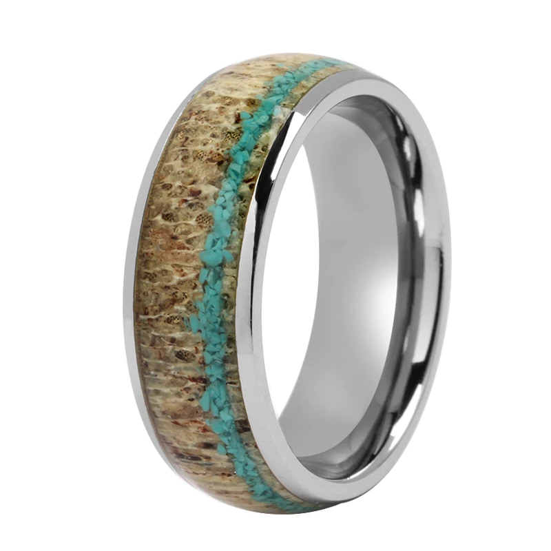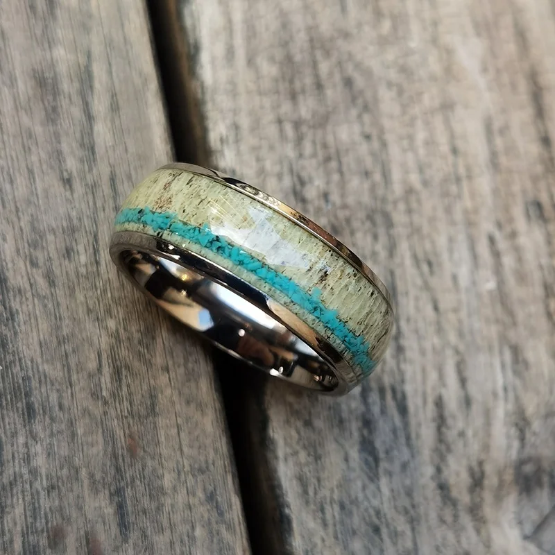 8mm Dome Nature Deer Ring Custom Titanium Ring Stainless Steel with Antler and Turquoise Inlay TIZTI Titanium Antler Men Ring