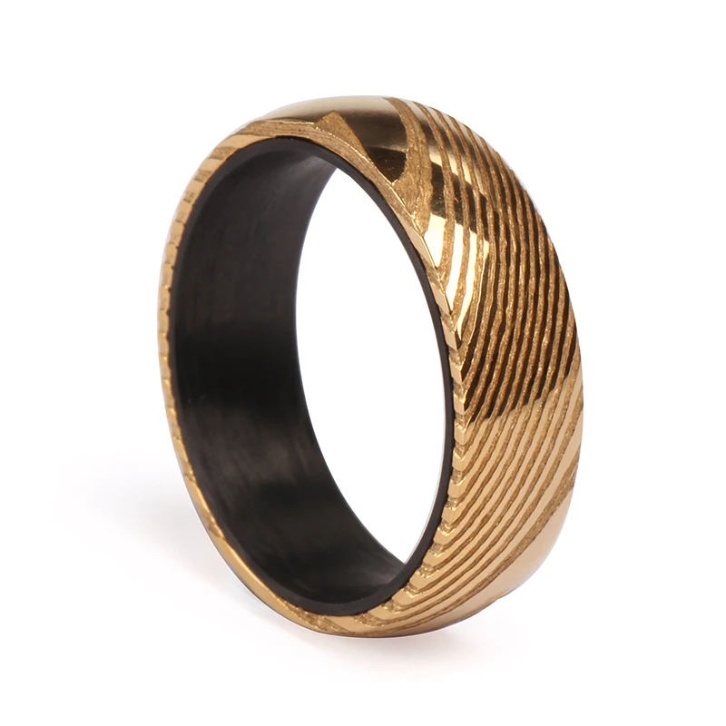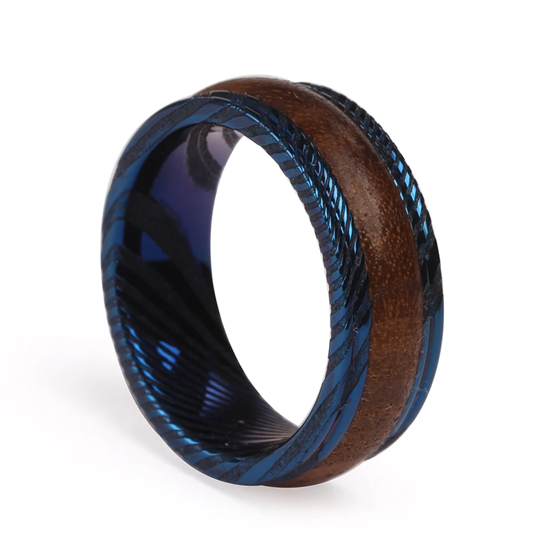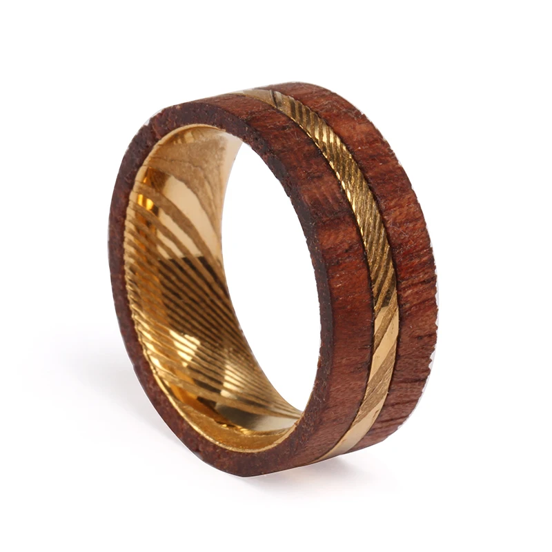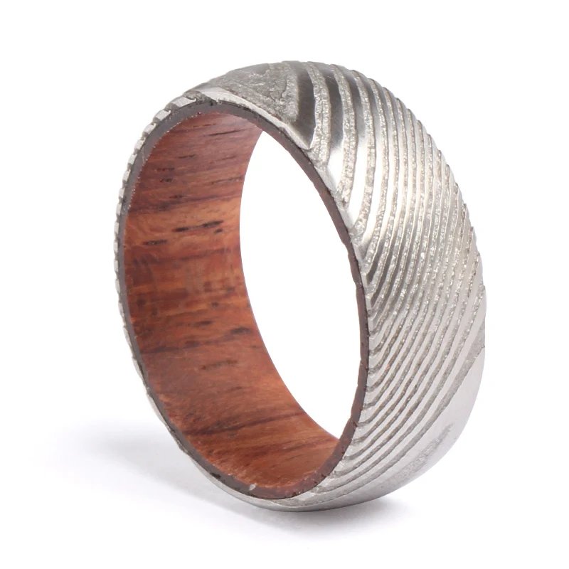 8mm 10mm Custom Wood Grain Men's Damascus Steel with Whiskey Barrel Wood Sleeve Inlay Wedding Band Ring Men
