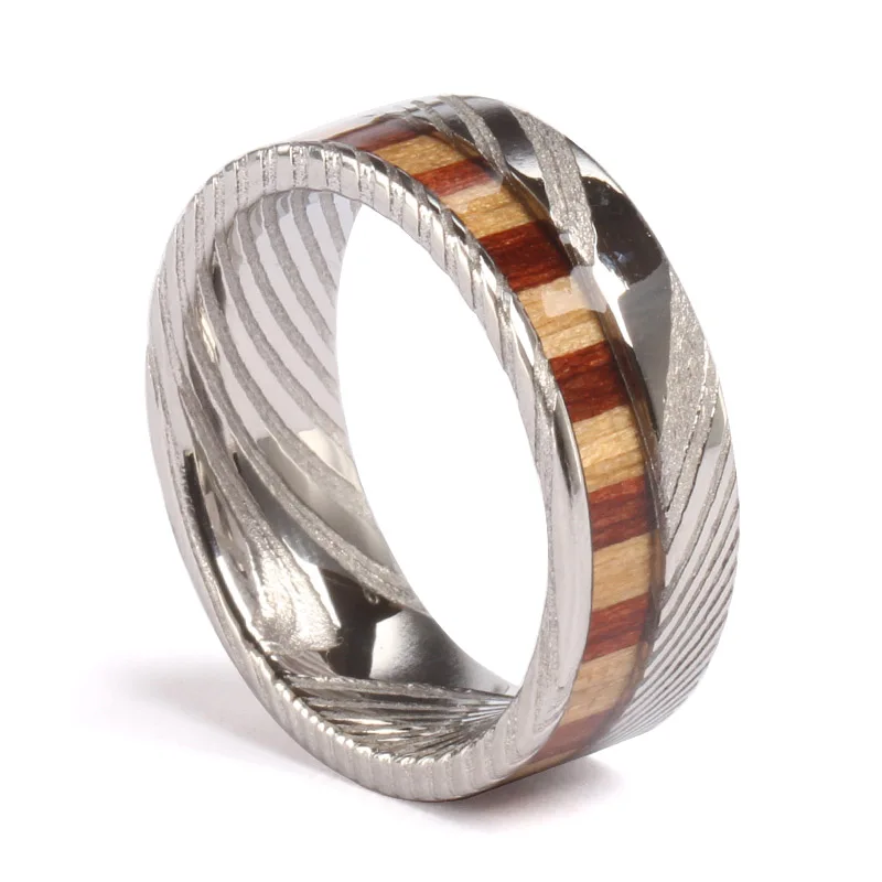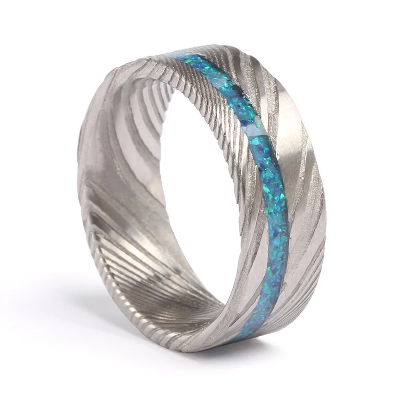 8mm Hammered Black Damascus Steel Ring Inlaid with Crushed Purple Agate and Opal TIZTI Men Wedding Band Damascus Steel Men Ring