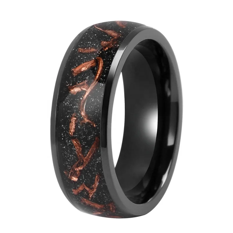 Fashion Dome 8mm Black Zirconium Ring with Black Sand Red Copper Filament and Crushed Opal Inlay Zirconium Men's Wedding Band