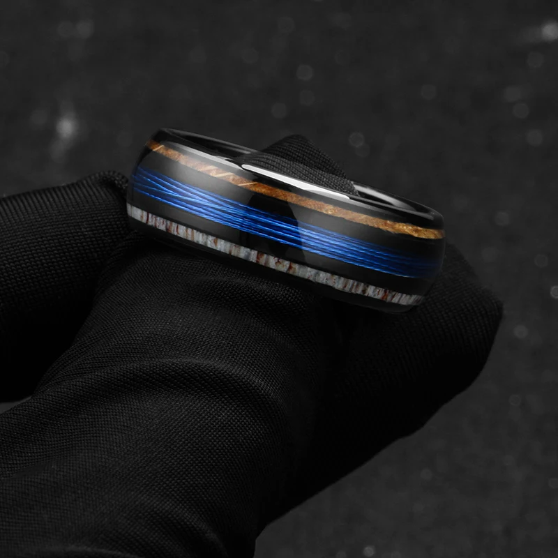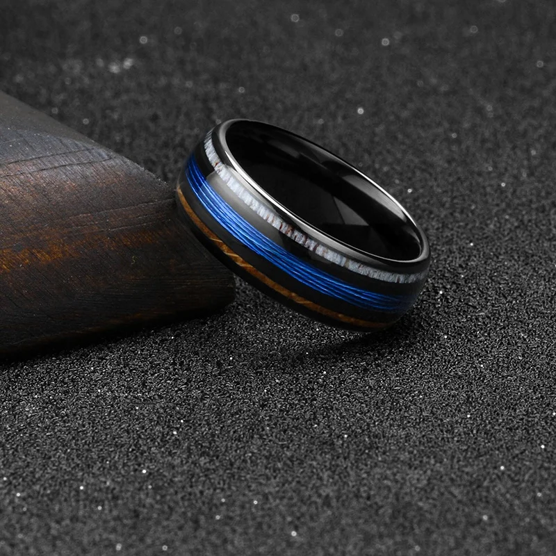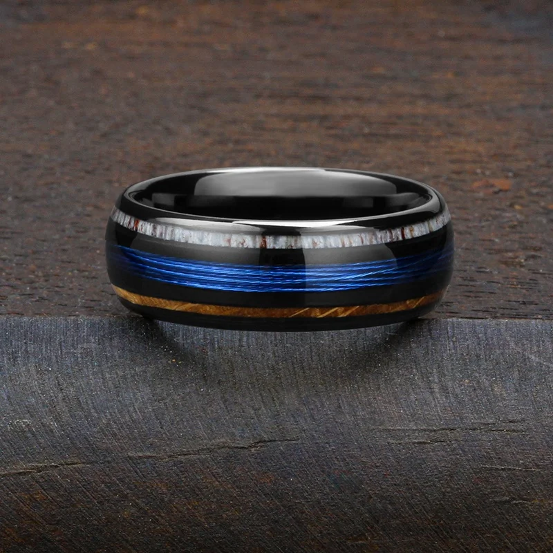 TIZTI Ring Jewelry 8mm Dome Shape Fishing Line Ring with Whiskey Barrel and Deer Antler Inlay Black Zirconium Tungsten Ring
