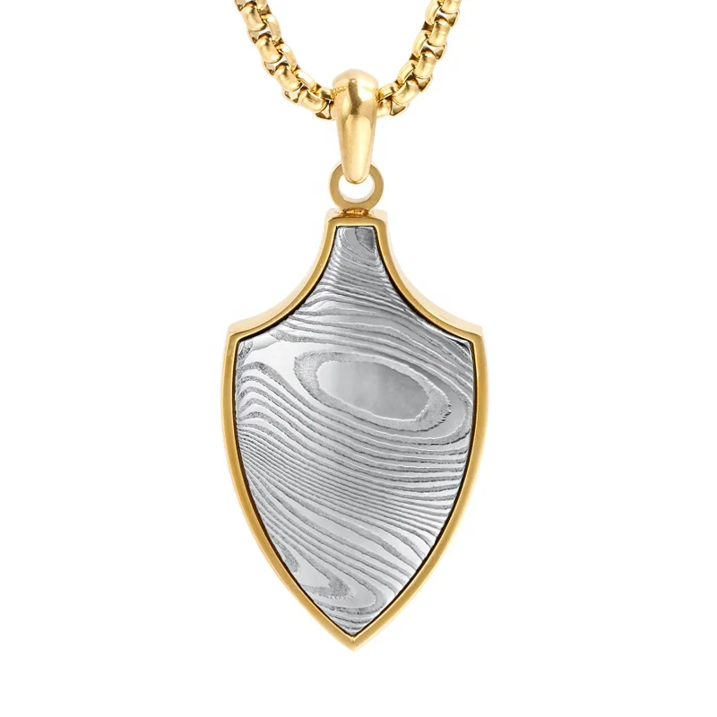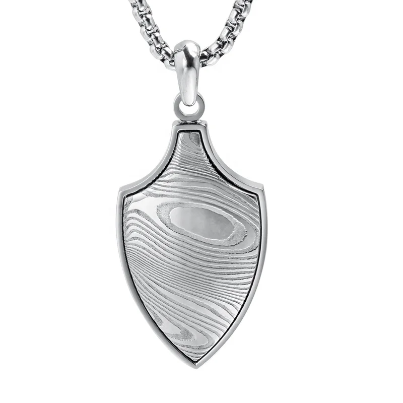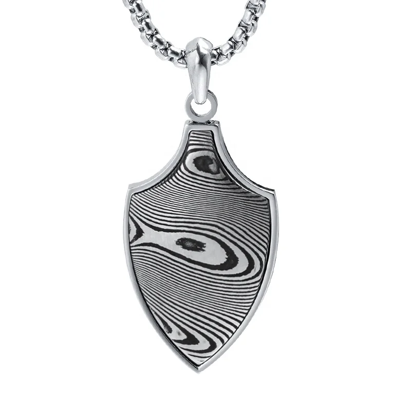 Men's Damascus Steel with Stainless Steel Shield Pendant Necklace Unique Damascus Steel Charming Men Pendant