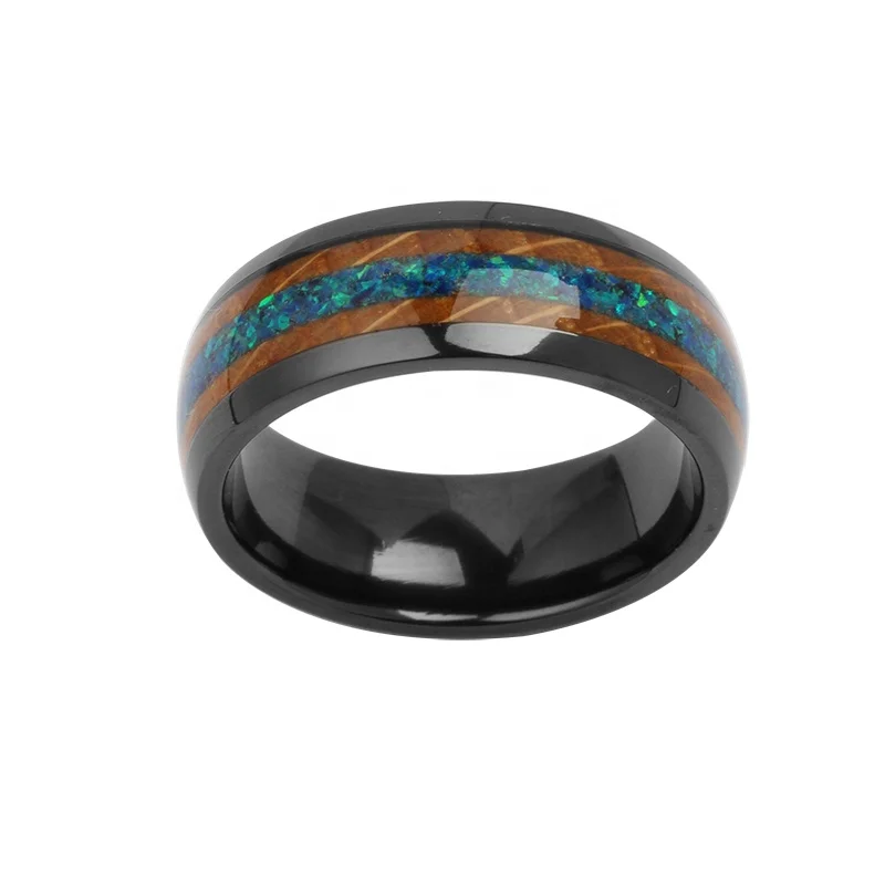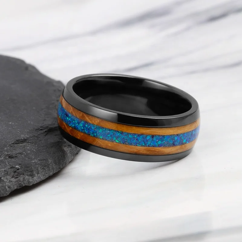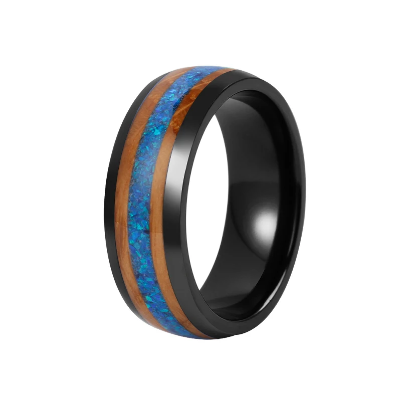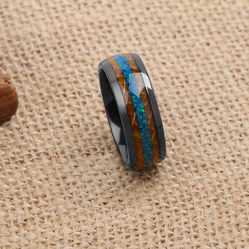 8mm Wedding Band Dome Comfort Fit Blue Opal and Whiskey Barrel Wood Tri-Inlay Black Zirconium Ring for Men