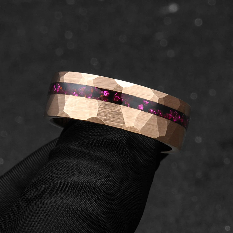 Hammered Amethyst Promise Ring Rose Gold Tungsten with Purple Gemstone Amethyst Inlay Men's Wedding Bands