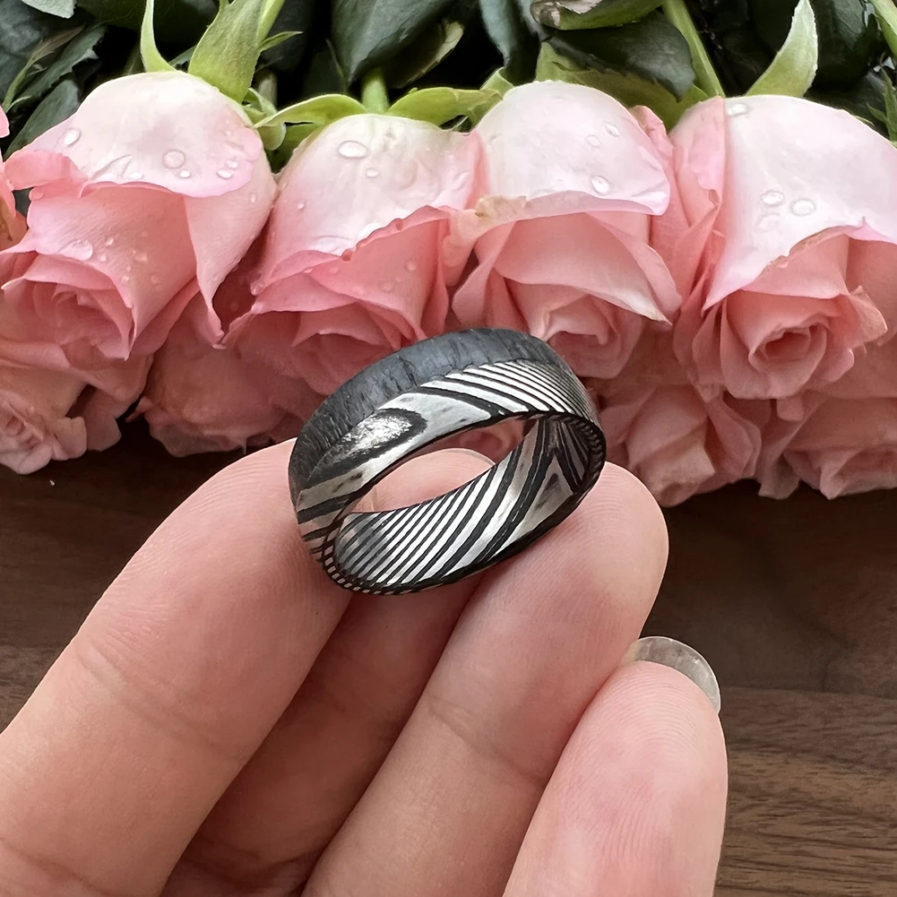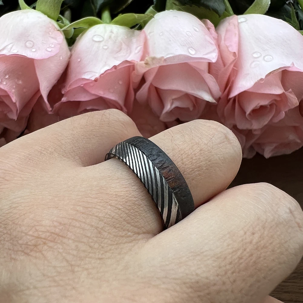 8mm Wood Ring for Men Black Damascus Steel Ring with Enbony Wood Inlay Wedding Bands TIZTI Ring