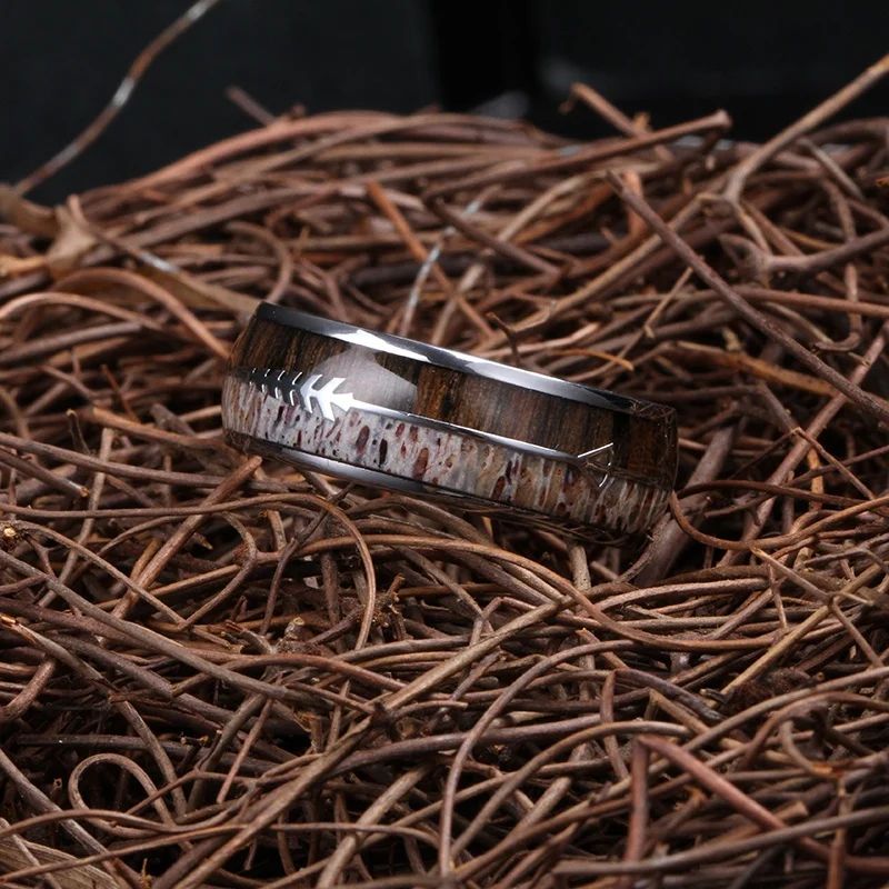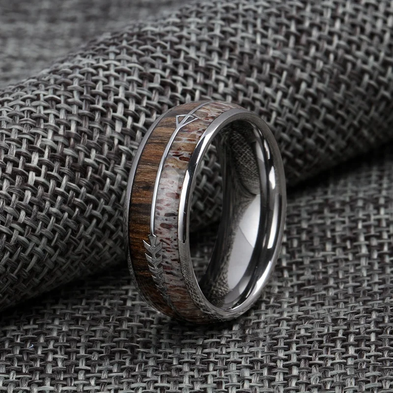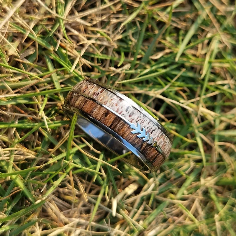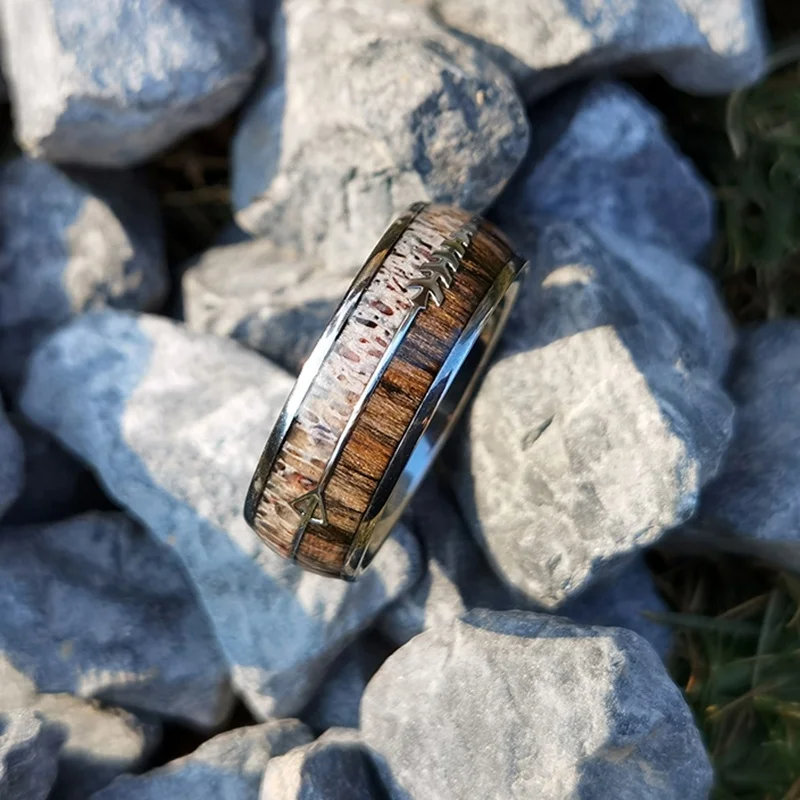 Epoxy Resin Antler and Wood Inlay Titanium Ring Stainless Steel Men 8mm Tungsten Carbide Ring Wedding Band