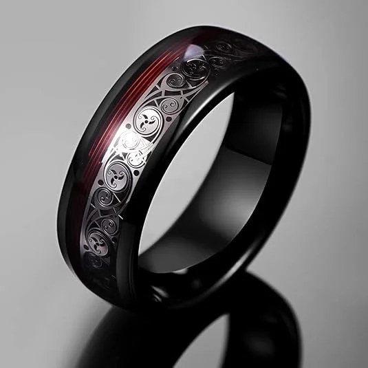 8mm Black Tungsten Ring for Men with Celtic Spiral and Red Guitar String Inlaid Custom Wedding Band
