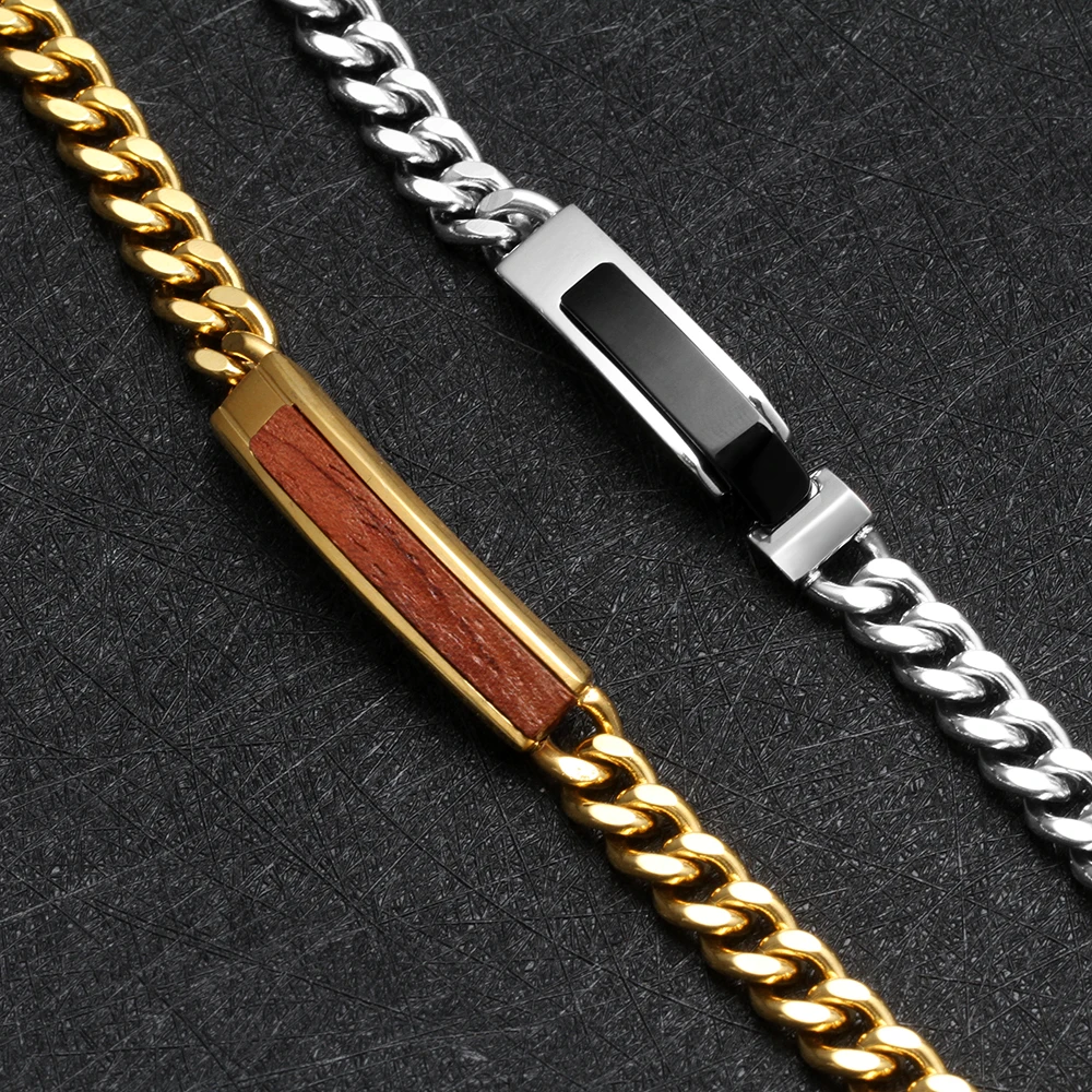 Trendy Yellow Gold Plated Cuban Chain Bracelet Bubinga Wood Inlay with Stainless Steel Fashion Link Jewelry