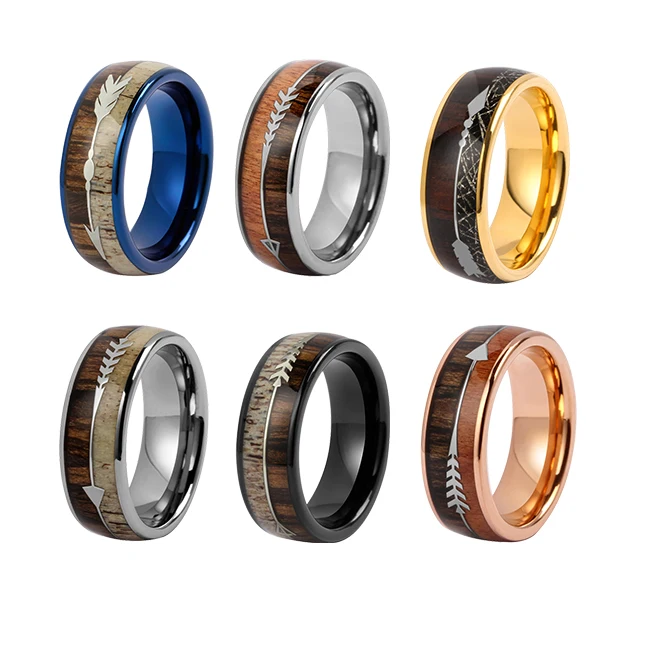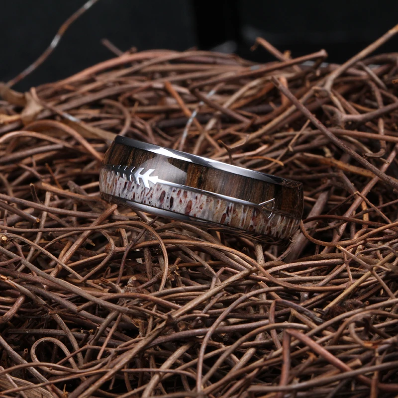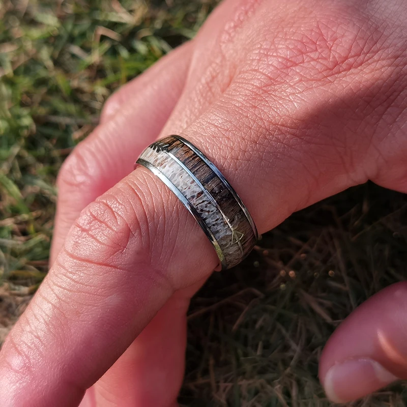 Wood & Deer Antler Inlay Ring Tungsten Titanium Band Custom Plating Colors Mens Wedding Ring Jewelry