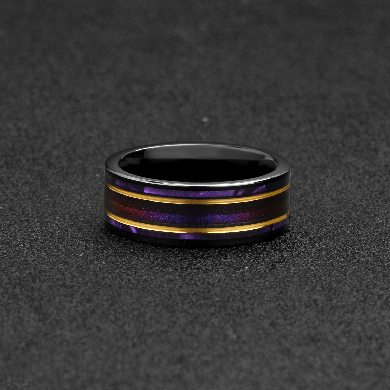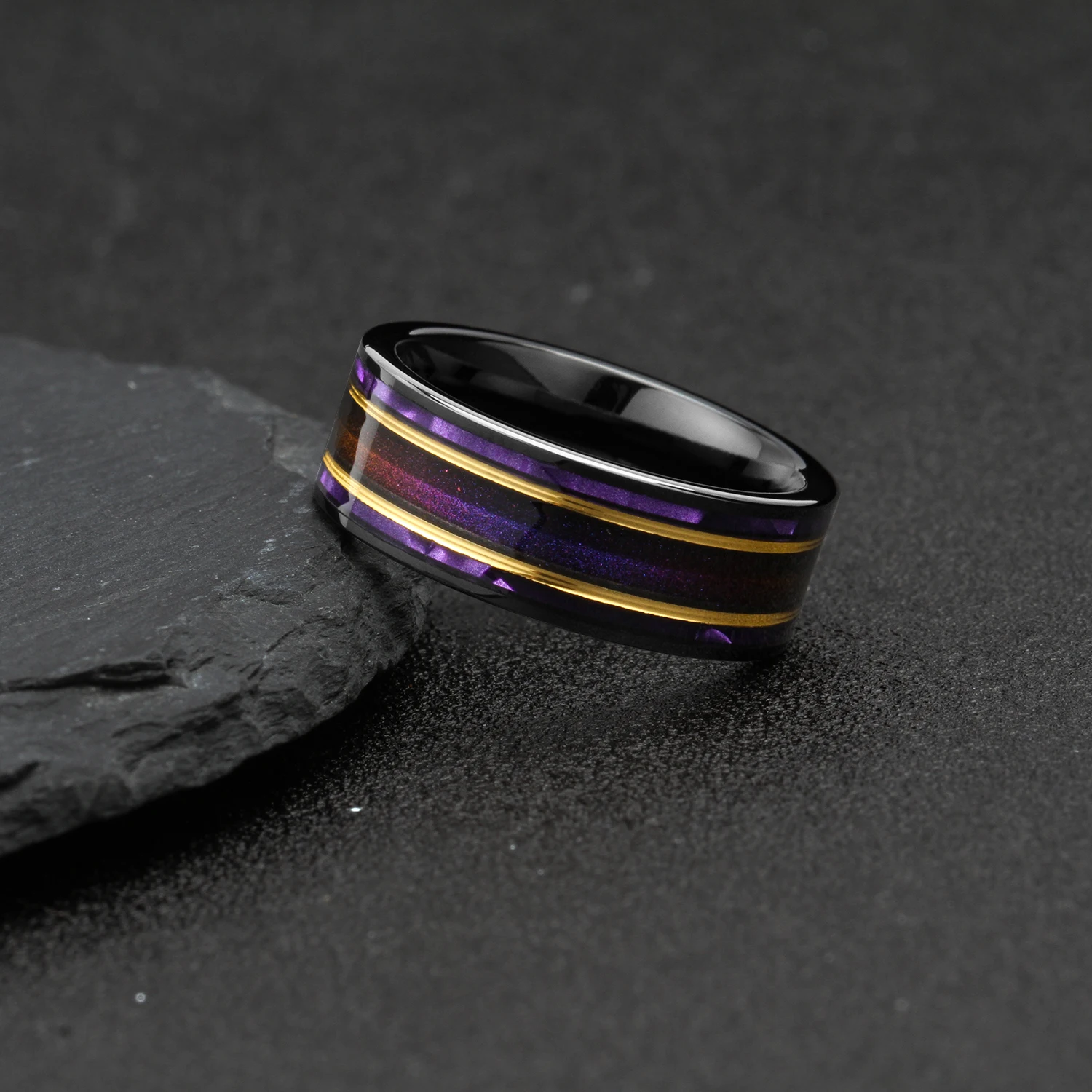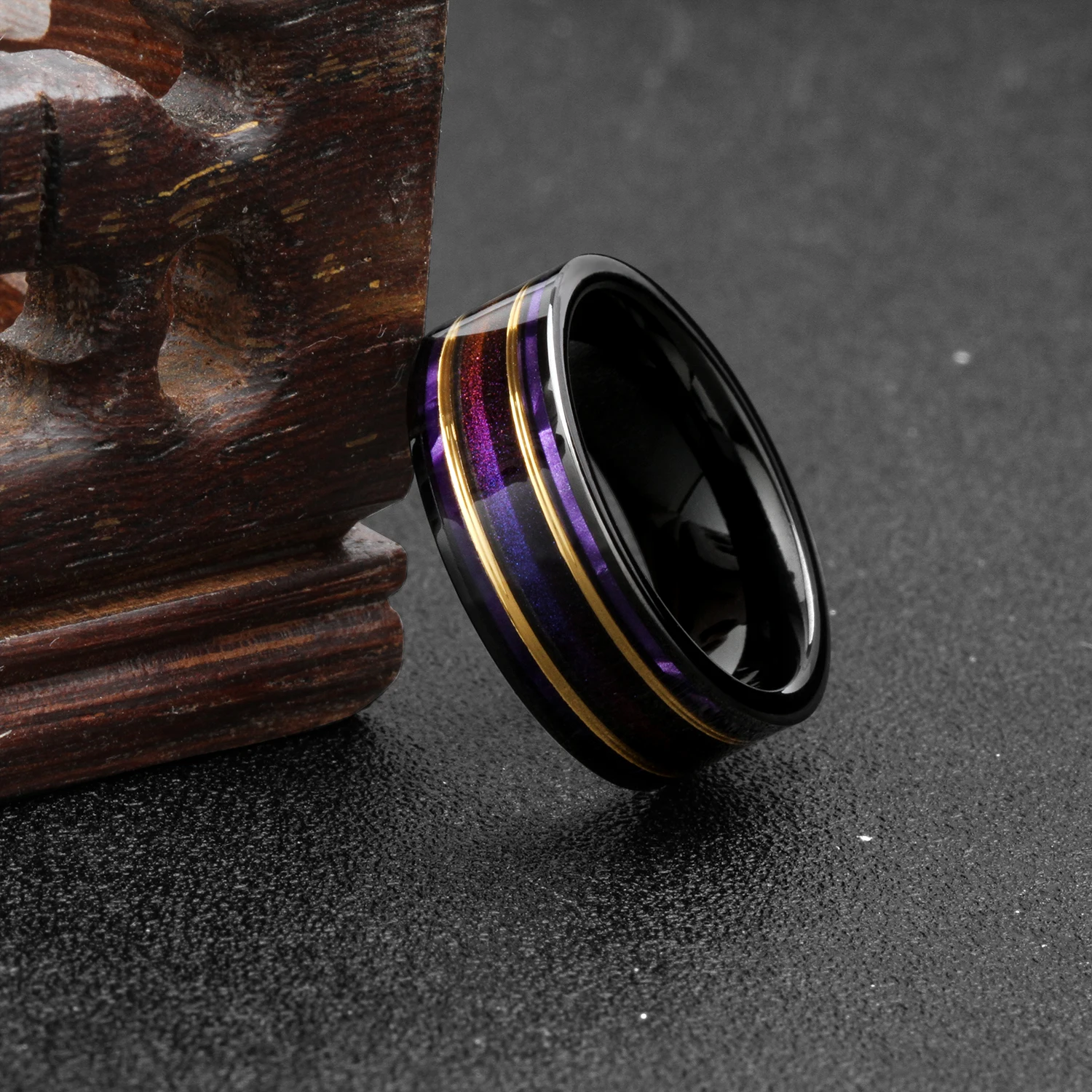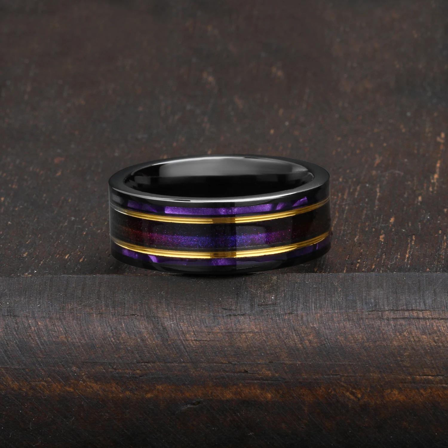 Exquisite Flat Black Tungsten Ring with Purple Shimmer-Sand Base Gold Inlay and Two Stripes Fashionable Mens Titanium Ring