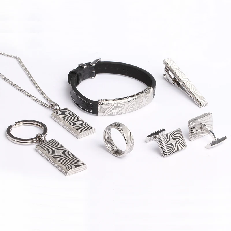 Blue Silver Tone Damascus Steel Fine Jewelry Set for Men Includes Keychain Bracelet Cufflinks Tie Clip Pendant-for Weddings