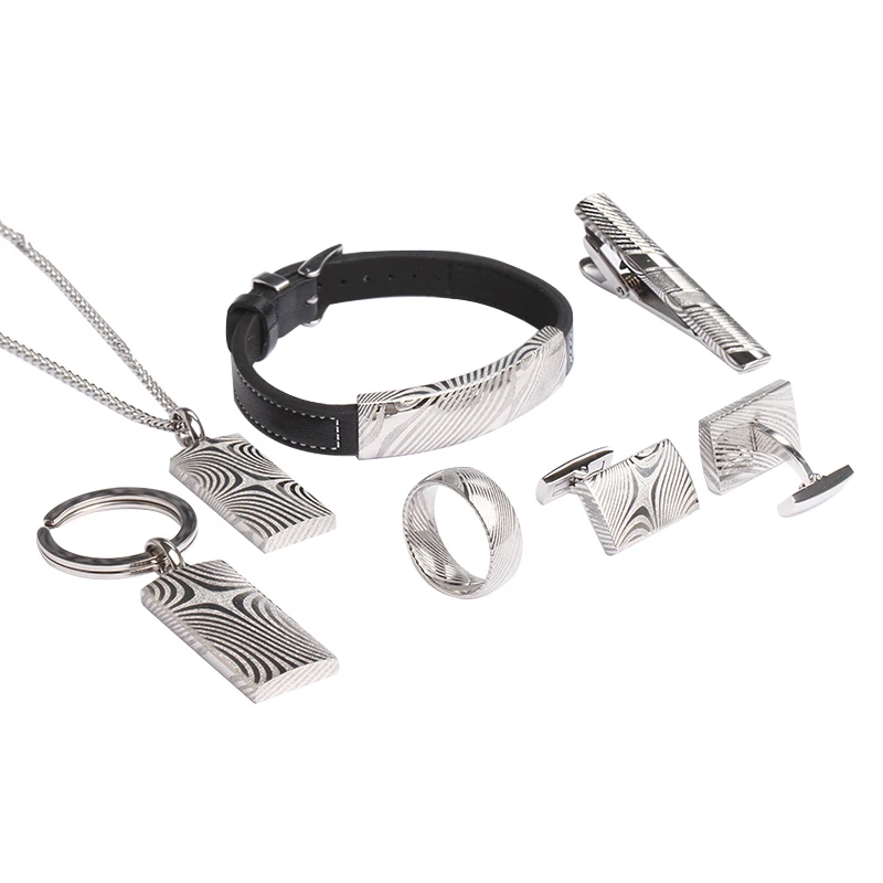 High Quality Damascus Steel Jewelry Rings Bracelets Cufflinks Tie Clip Pendant Keychain Set Yellow Gold Plated Jewelry Men