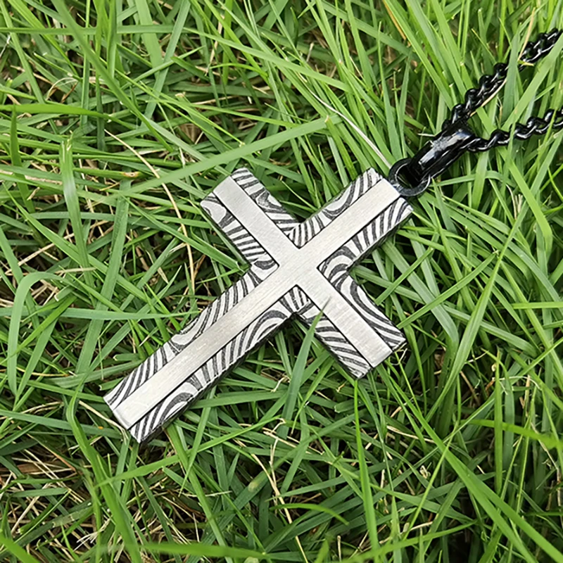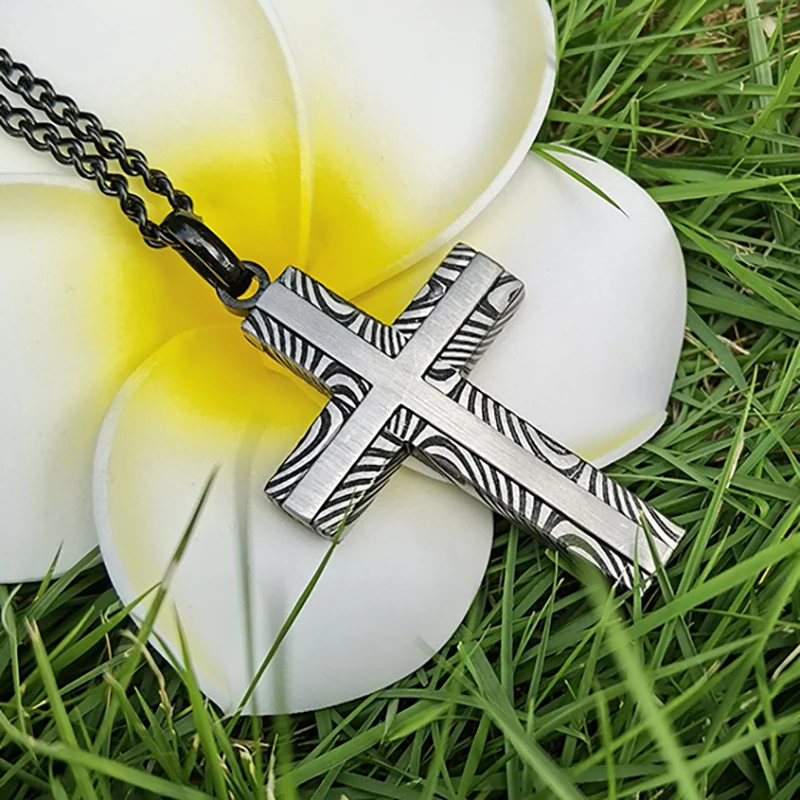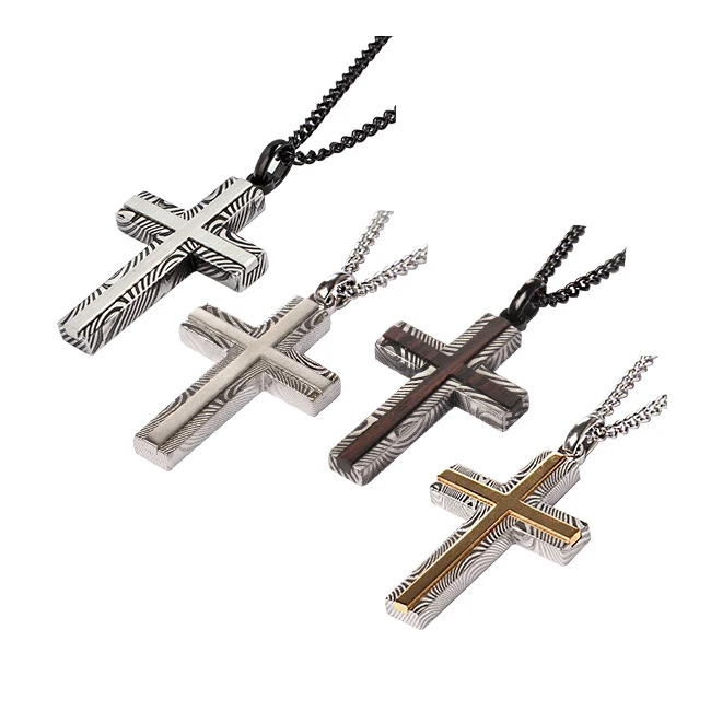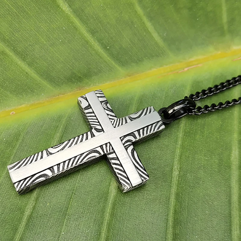 Black & Silver Plated Damascus Crucifix Pendant Mens Custom Stainless Steel Cross Pendant with Necklace