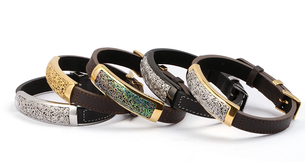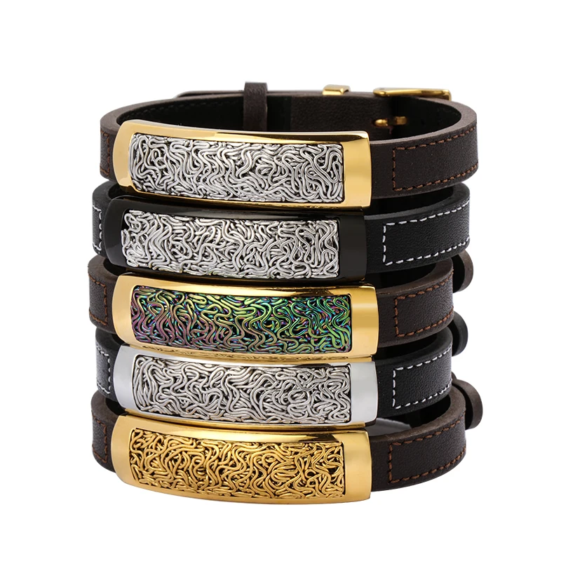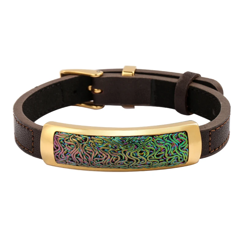 Fashion Jewellery Men Charm Genuine Brown Leather Bracelet Rainbow Cable Stainless Steel Jewelry