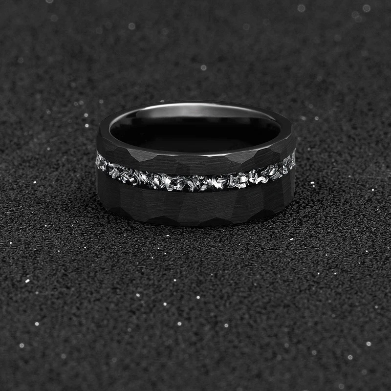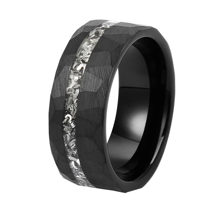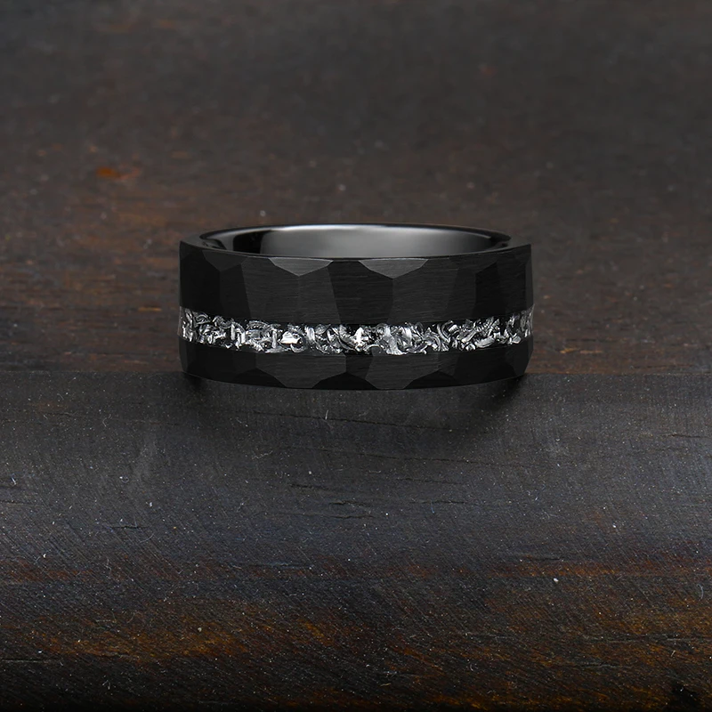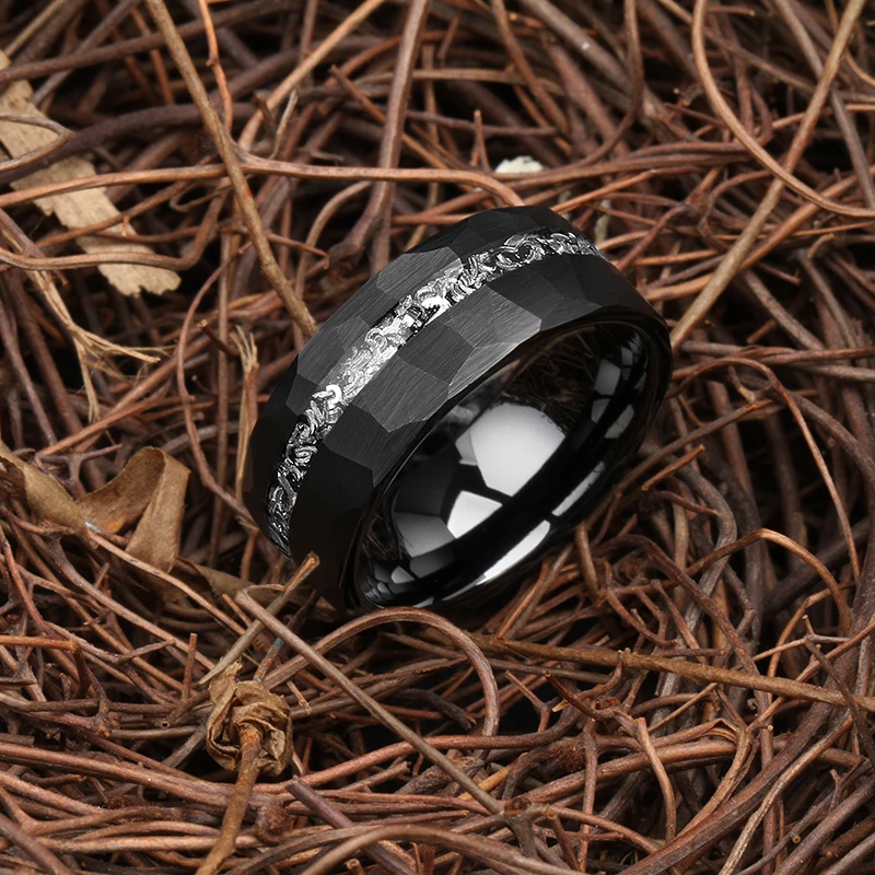 8mm Comfort Fit Muonionalusta Meteorite Fillings Black-Plated Faceted Hammered Tungsten Wedding Band for Men