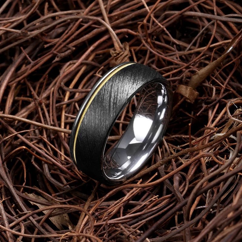 8mm Comfort Fit Domed Tizti Men's Wedding Ring Gold Guitar String Design Mix Brushed Finish Classic Mens Tungsten Rings