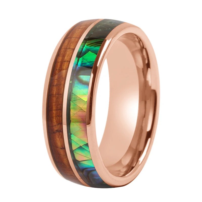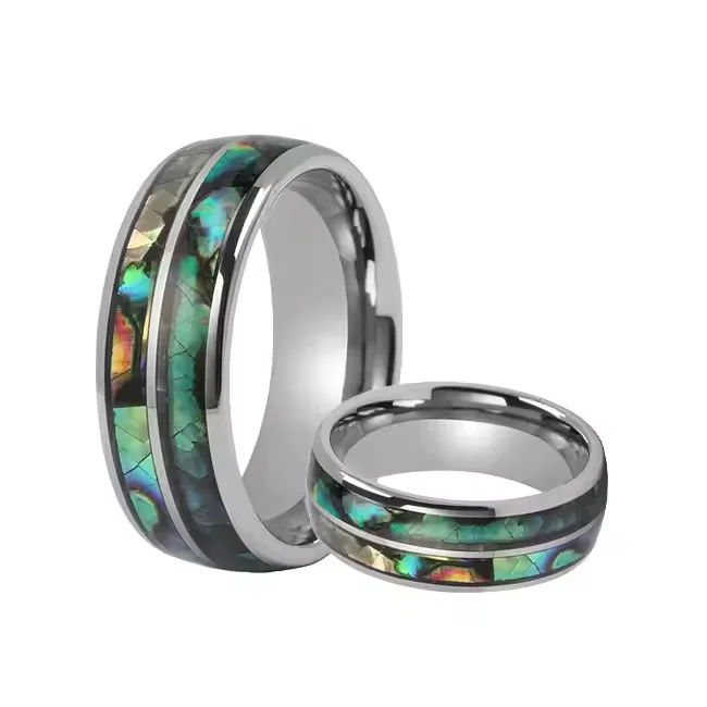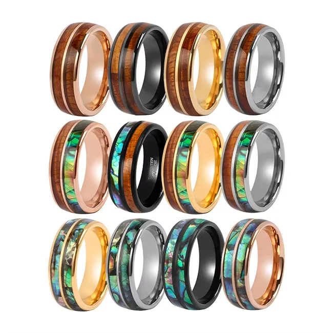 8mm Dome Tungsten Carbide Ring Natural Abalone Shell Opal Wood Inlay Mens Ring Jewelry