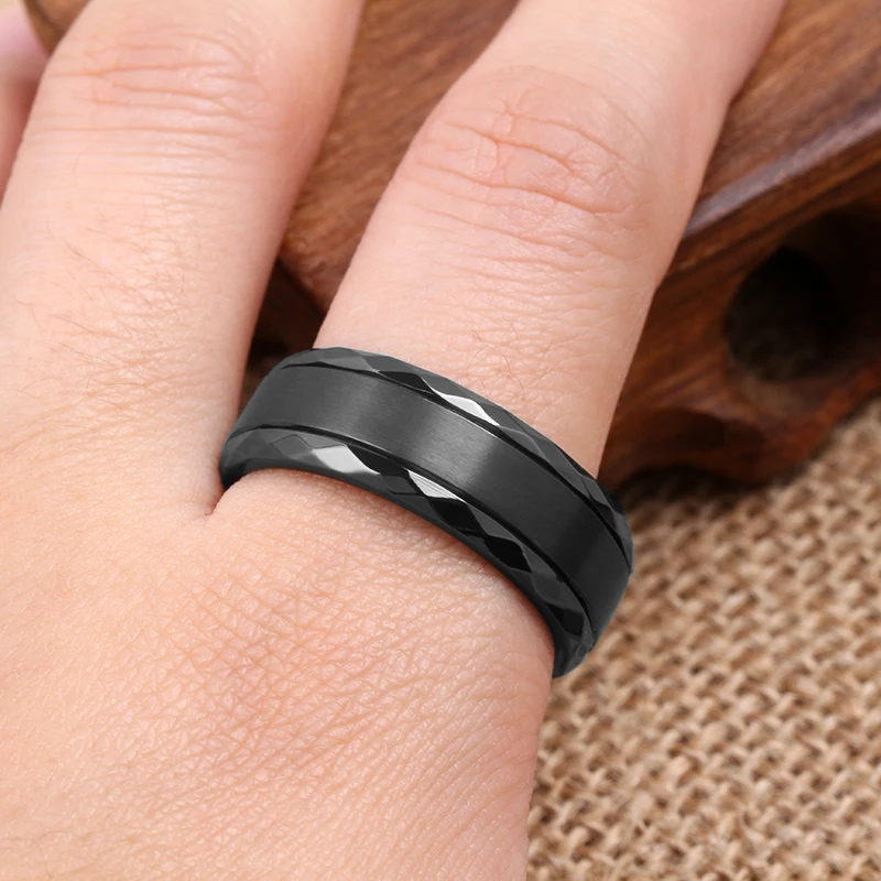 8mm Faceted Edge Men's Black Ceramic Ring Stainless Steel Wedding Black Zirconium Jewelry