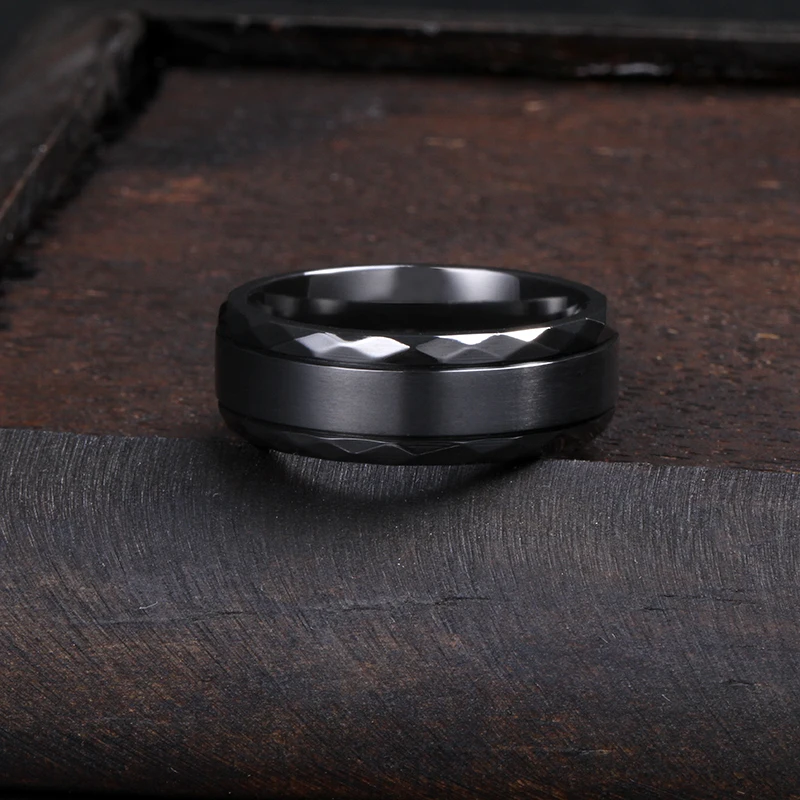 Never Fade Black Zirconium with Brushed Faceted Edges Stainless Steel Mens Jewelry Eternity Titanium Ring