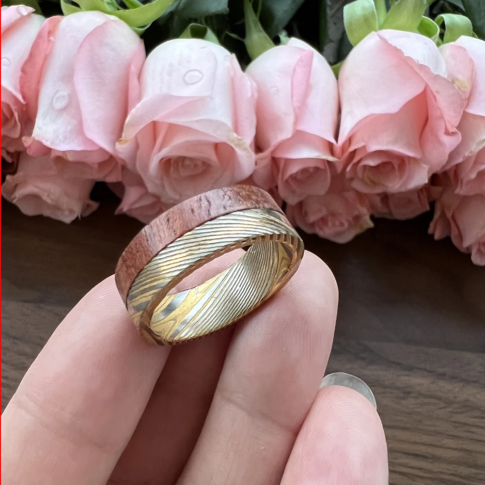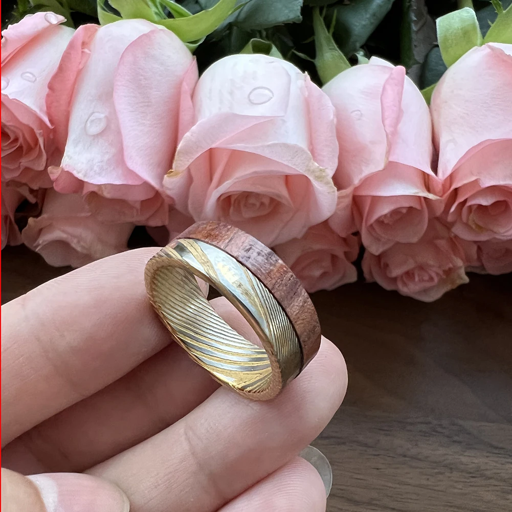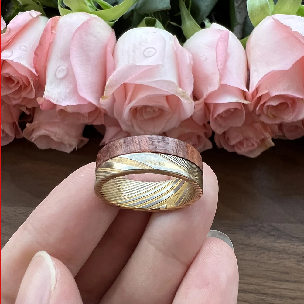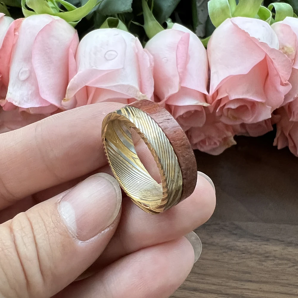 18K Plating TIZTI Manufactur Customized Forged Etched Men's Bubinga Wood Inlay Damascus Style Wedding Ring