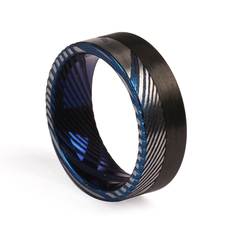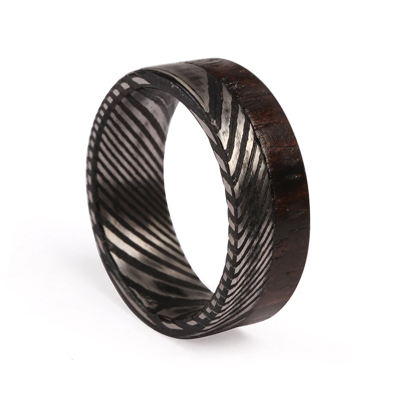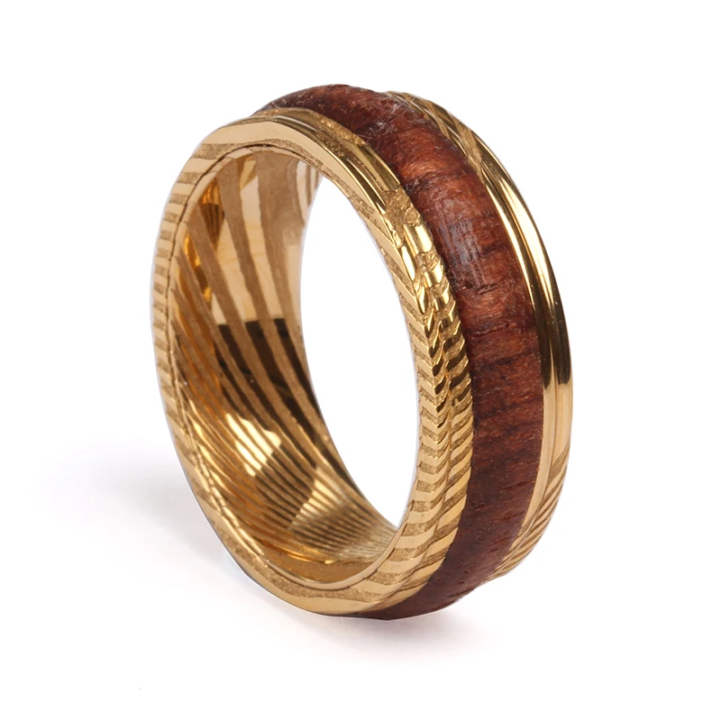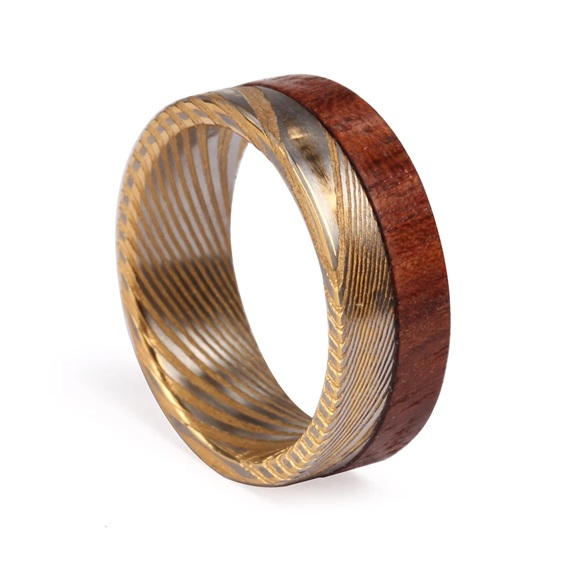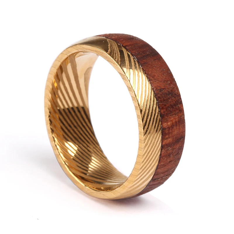 8mm Yellow Gold Plated Stainless Damascus Bubinga Wood Inlay 8mm Mens Wedding Bands