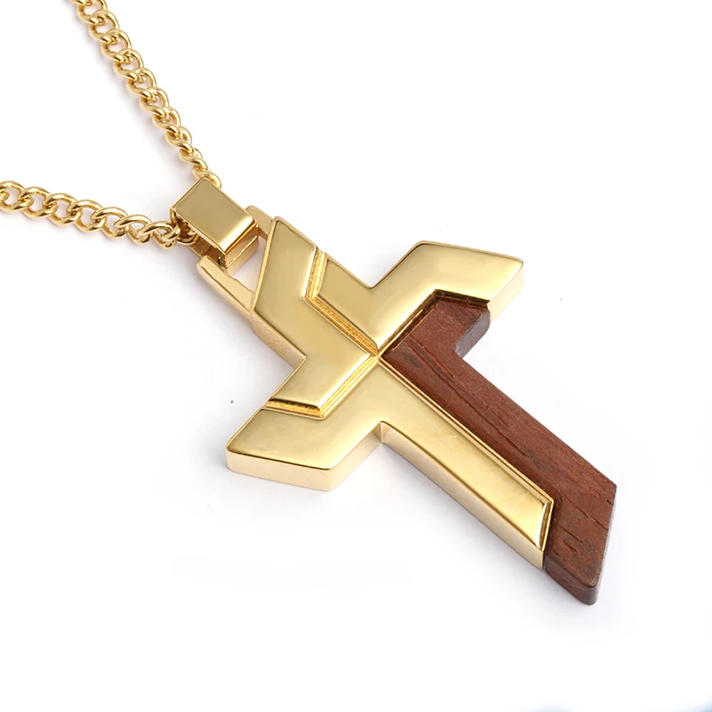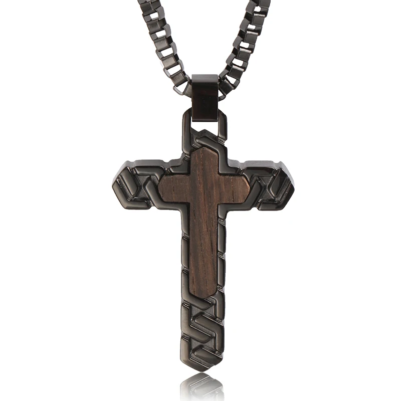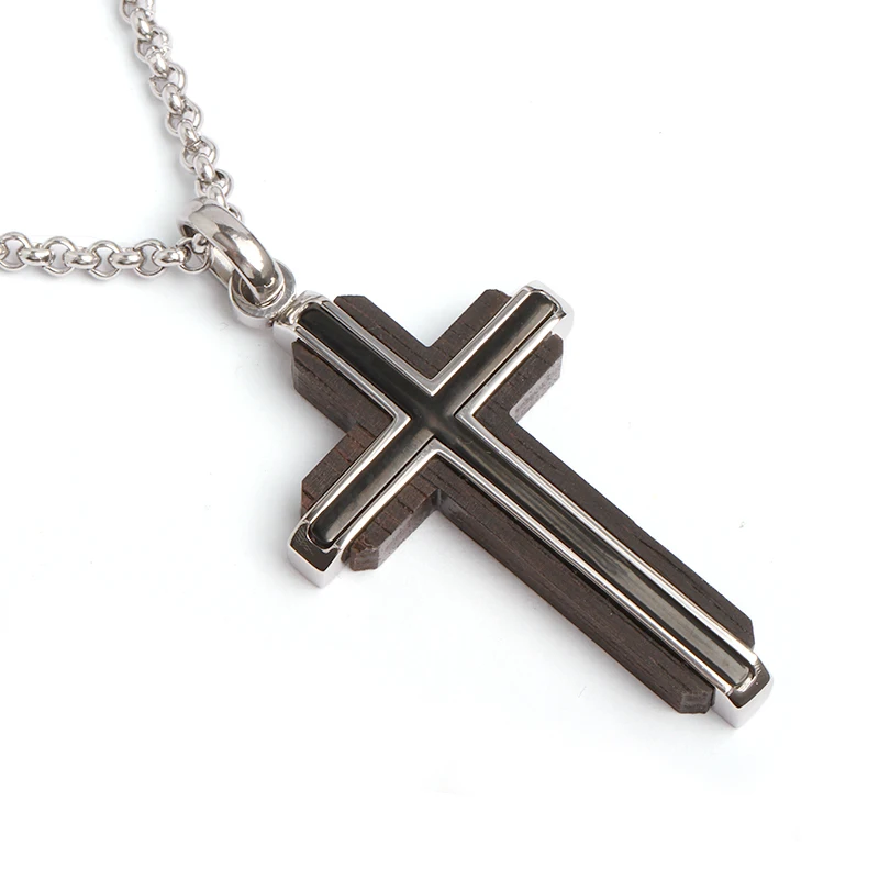 Double Crosses Stainless Steel Necklace Wooden Cross Pendant Necklace Men Pendants