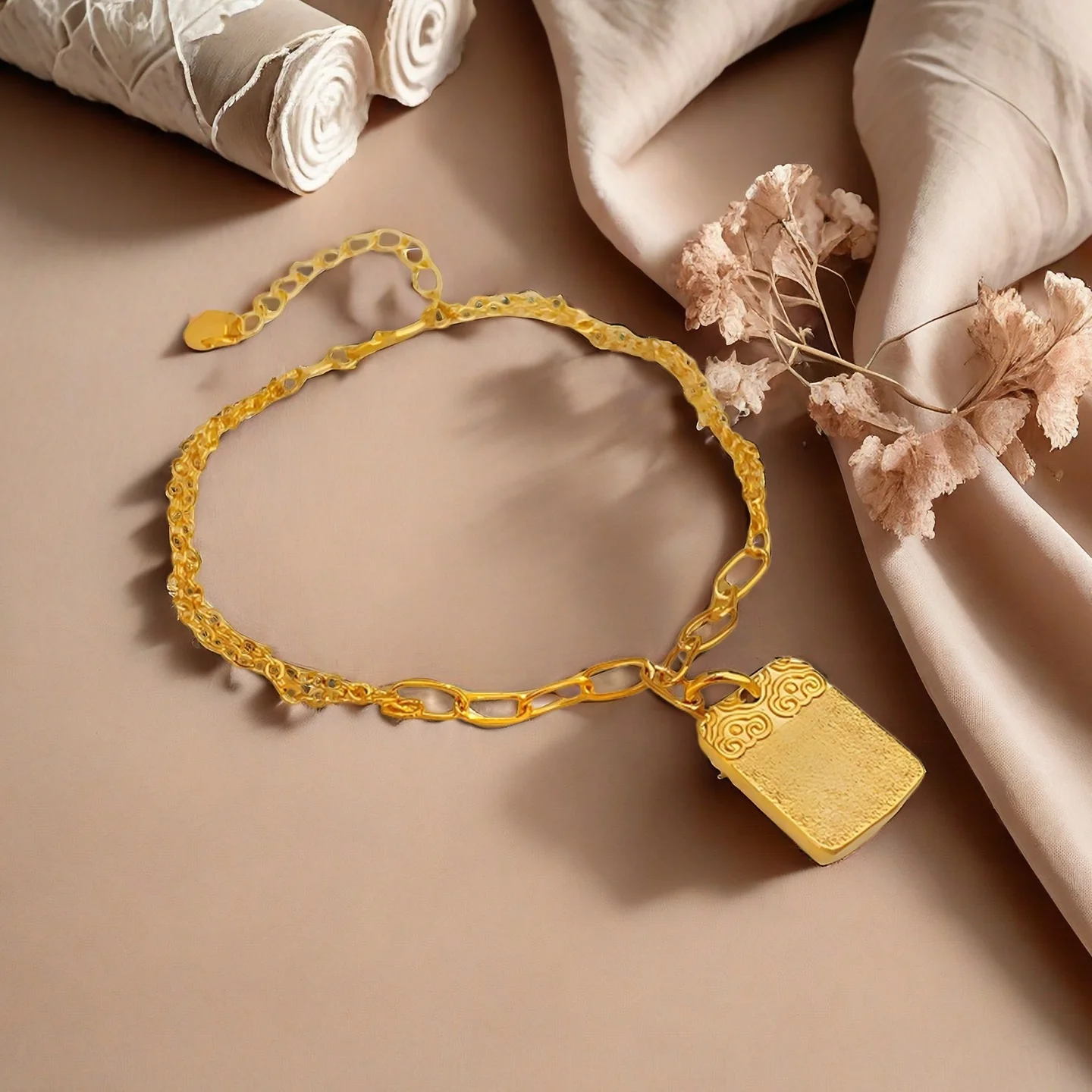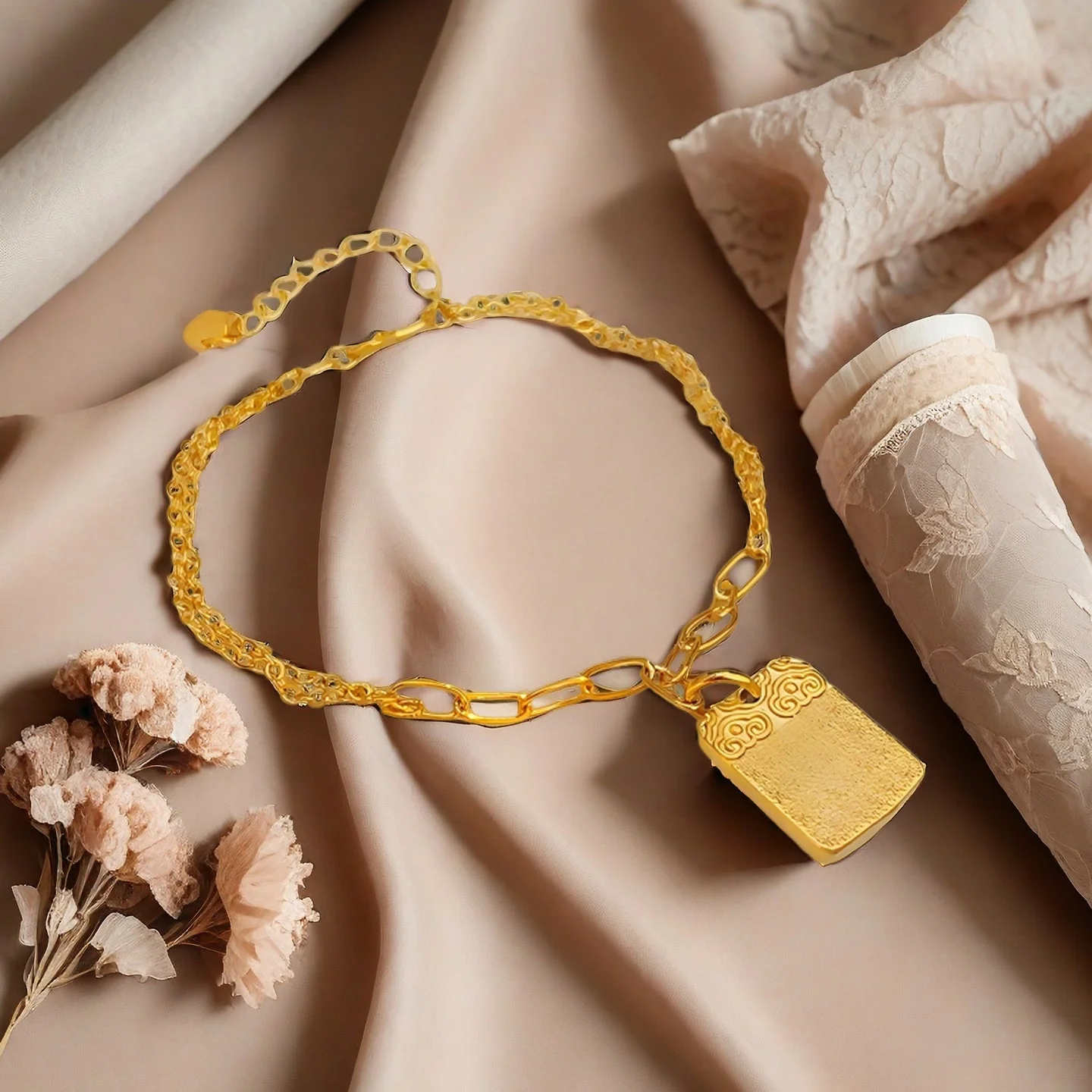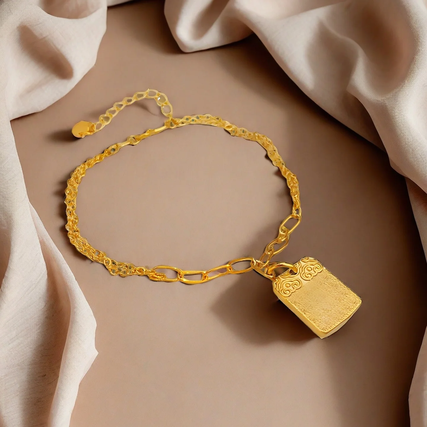 Golden Lock Shaped Pendant Bracelet Double Layer Chain Bracelet with Chinese Style Pattern Elegant Party Jewelry for Women
