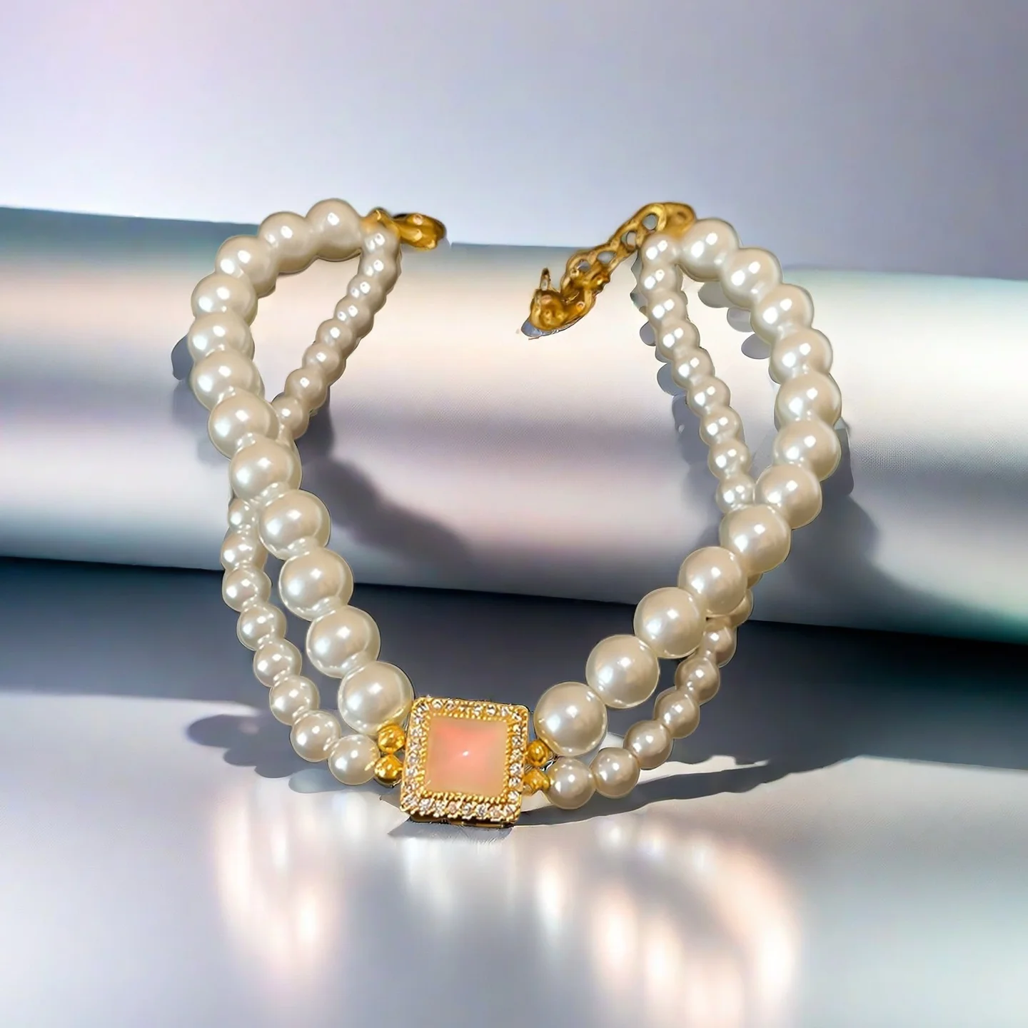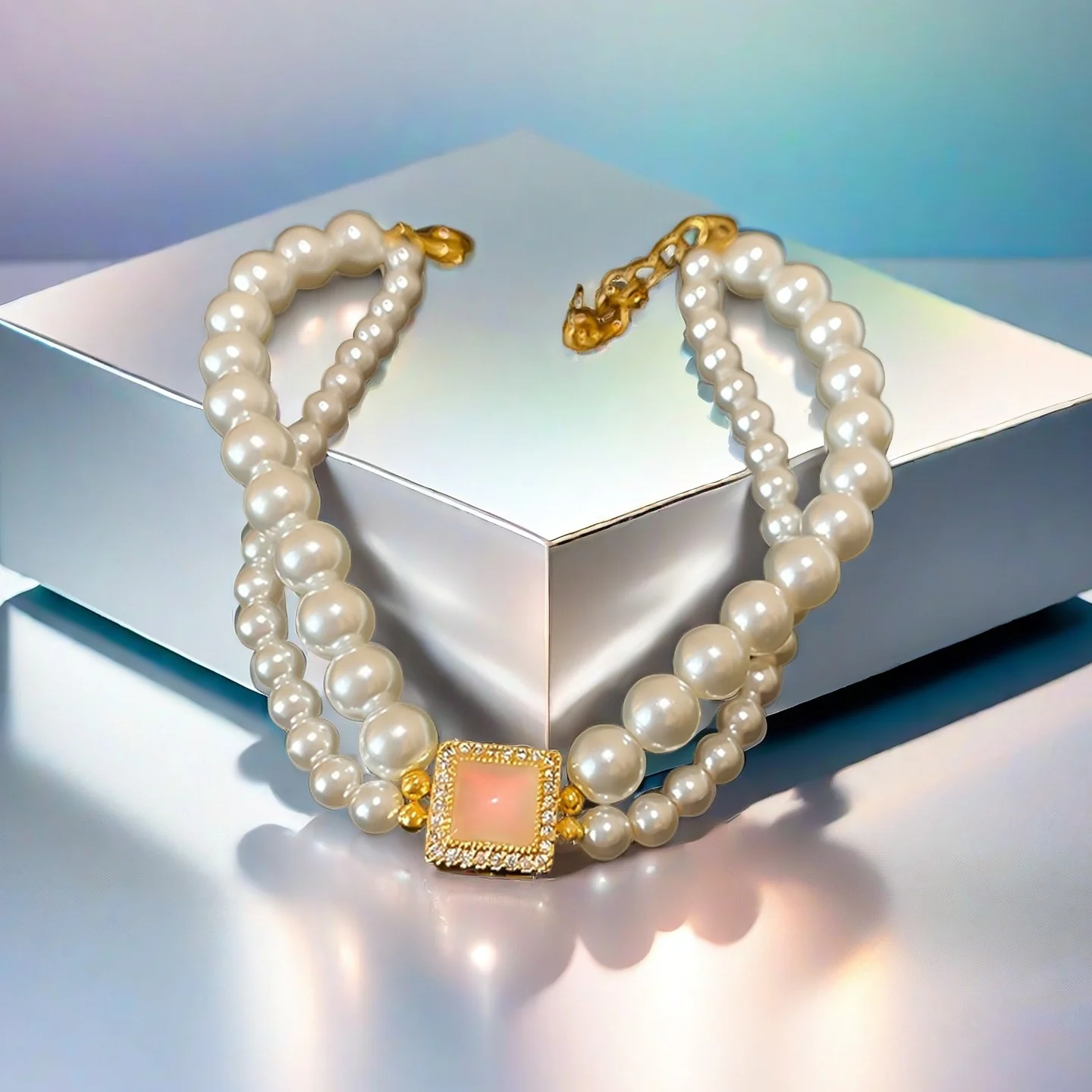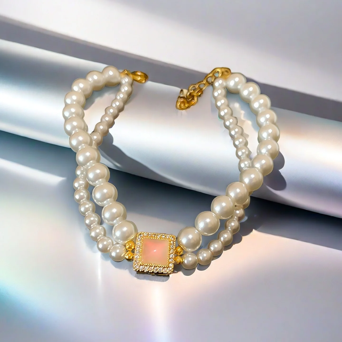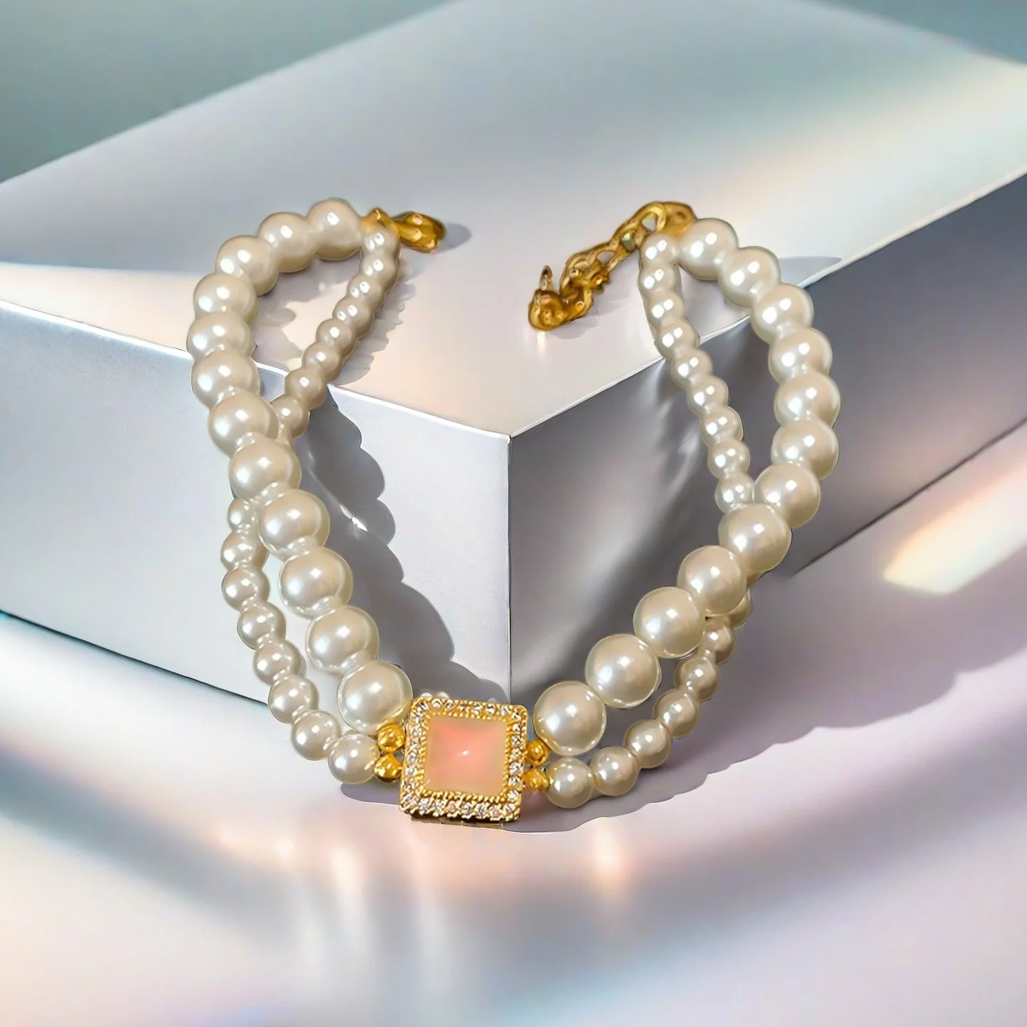 Double Layer Pearl Bracelet with Square Opal Zircon Accent Elegant Gold Plated Bracelet for Women Luxury Party Jewelry