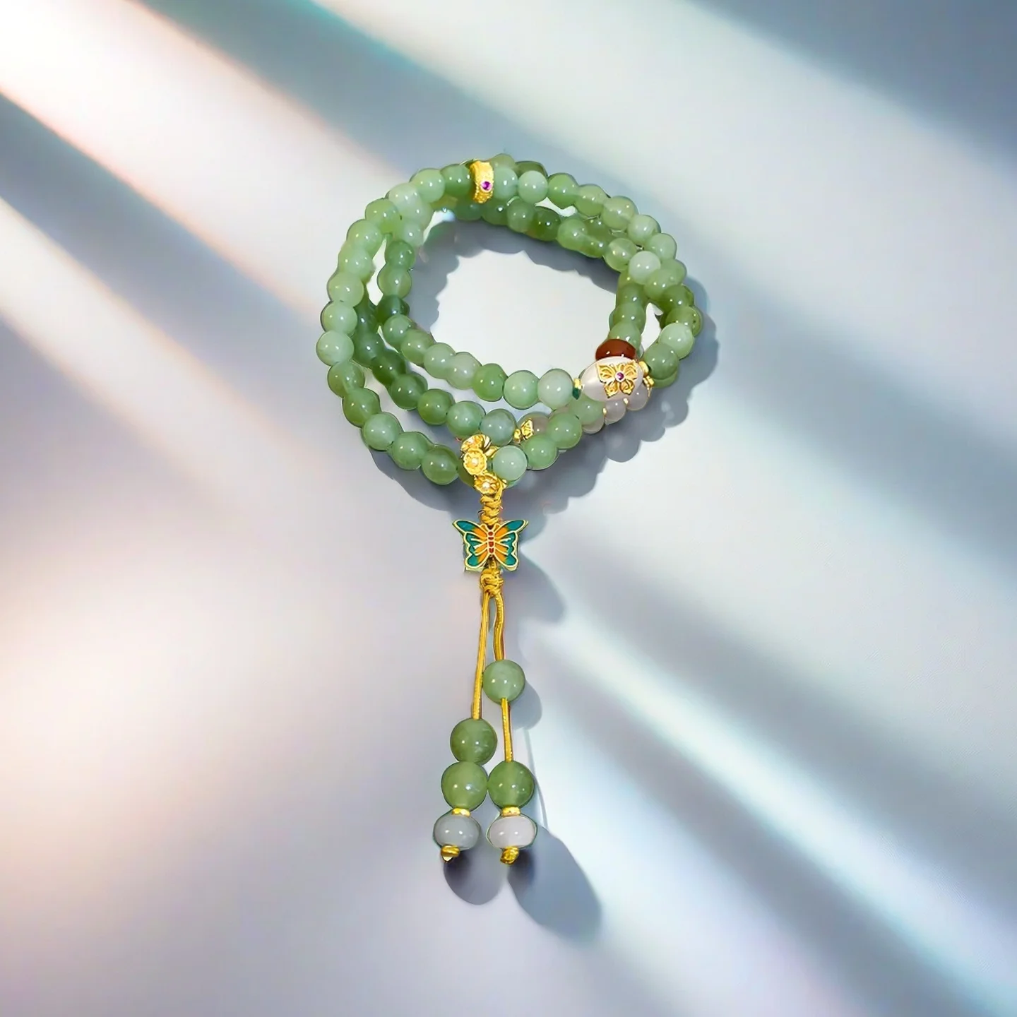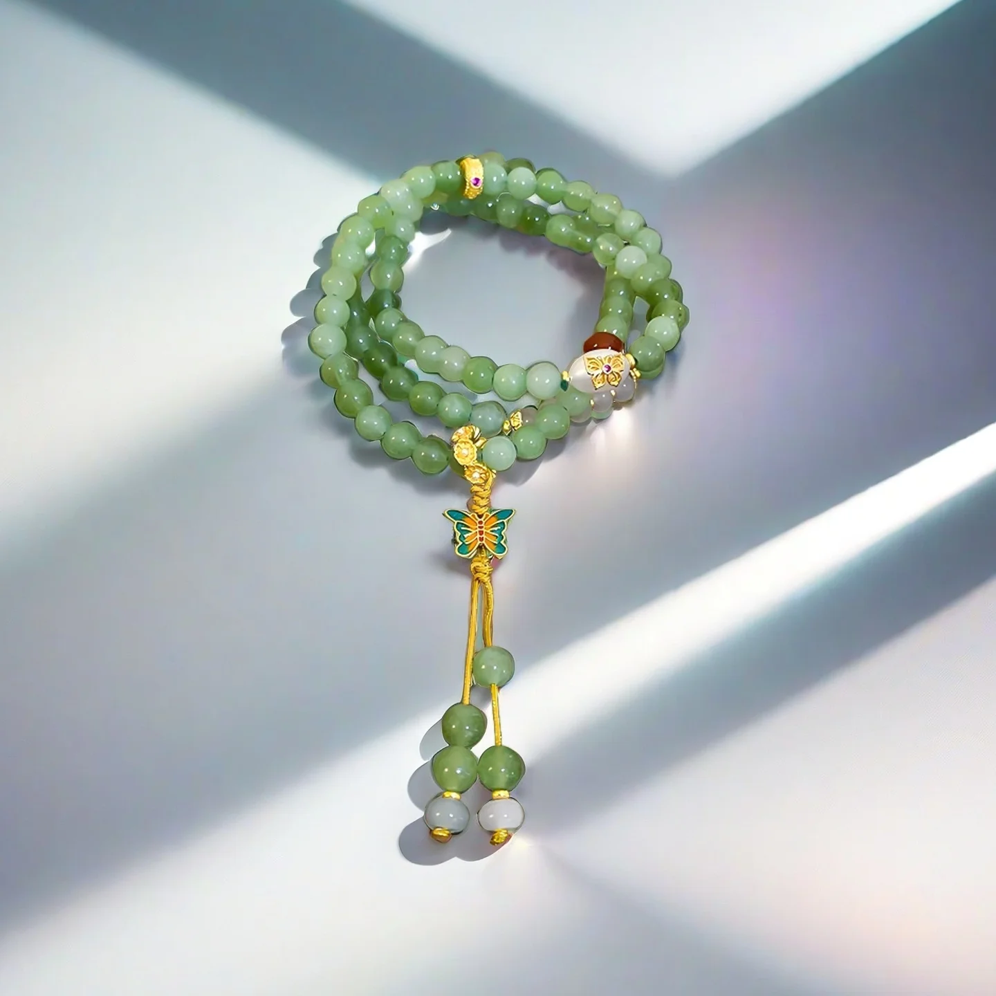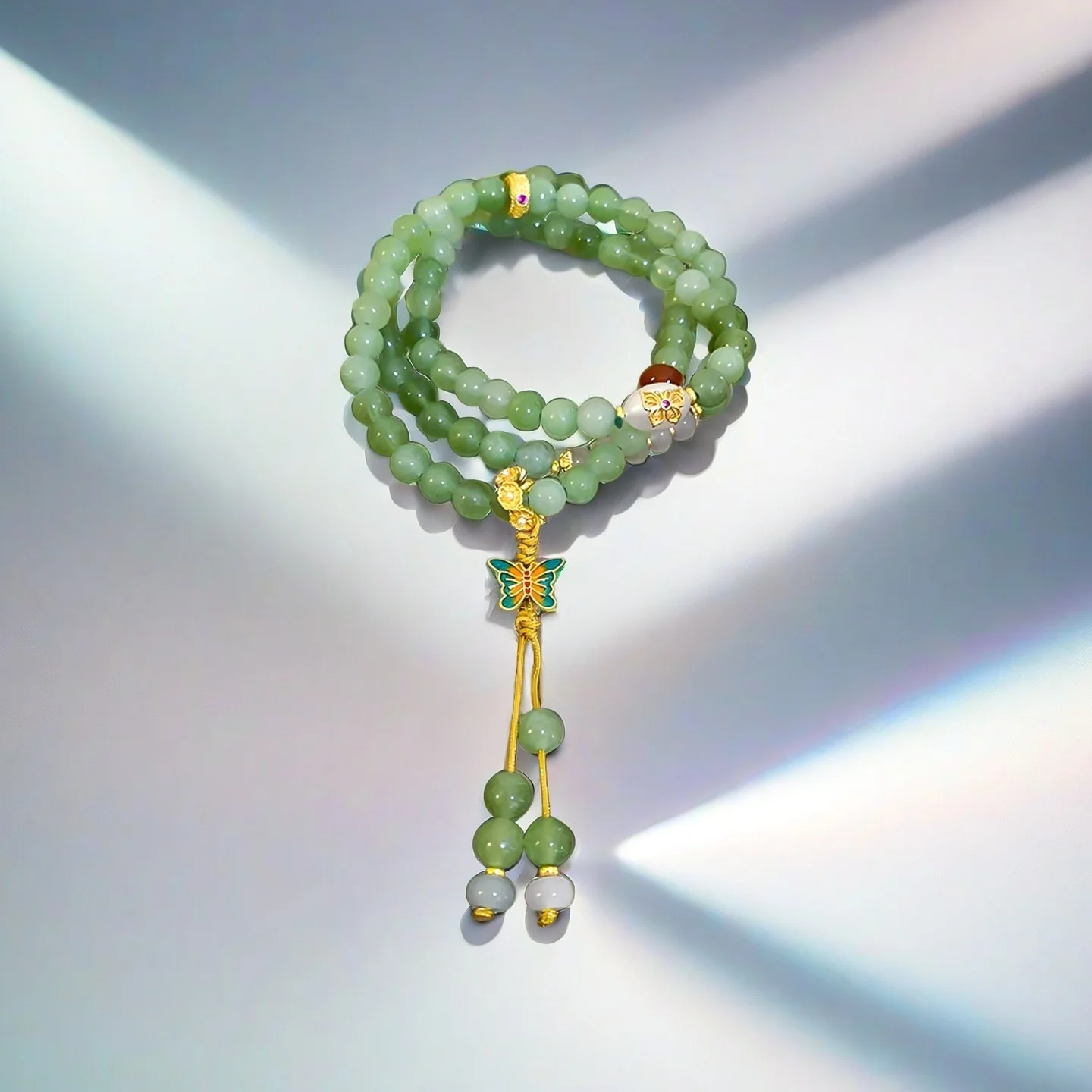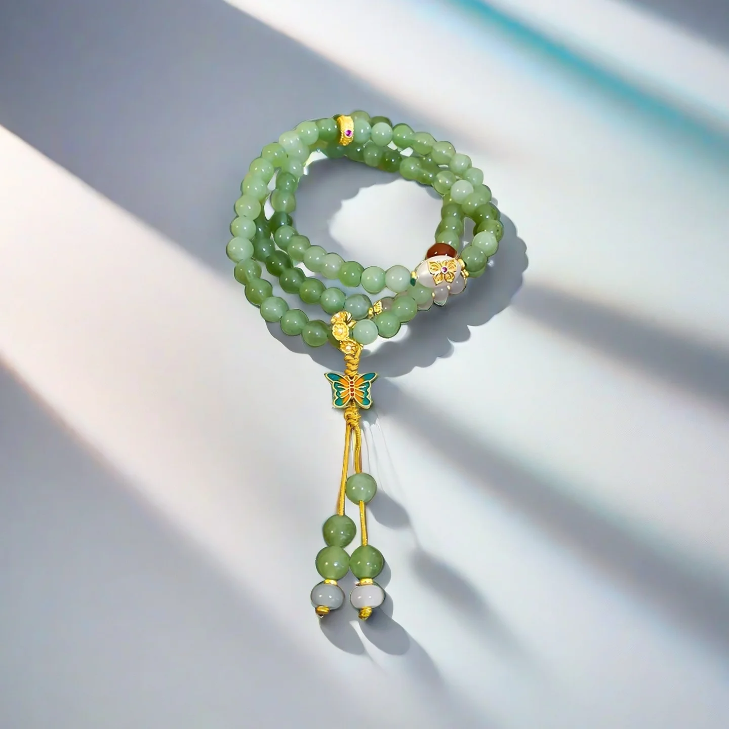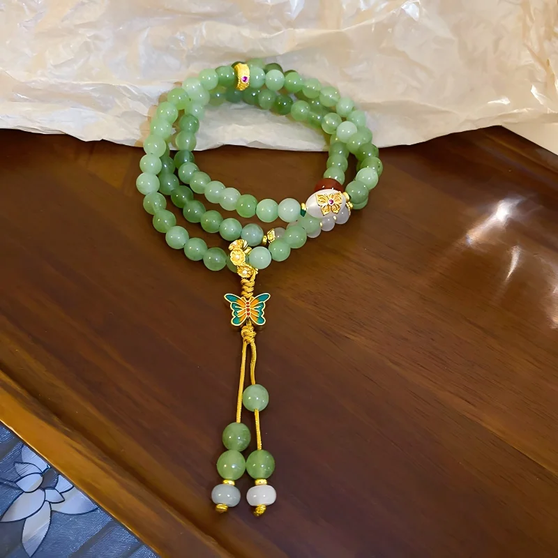 Beaded Bracelet with Enamel Butterfly Charm Multi Layer Buddhist Prayer Beads Bracelet Chinese Style Jewelry