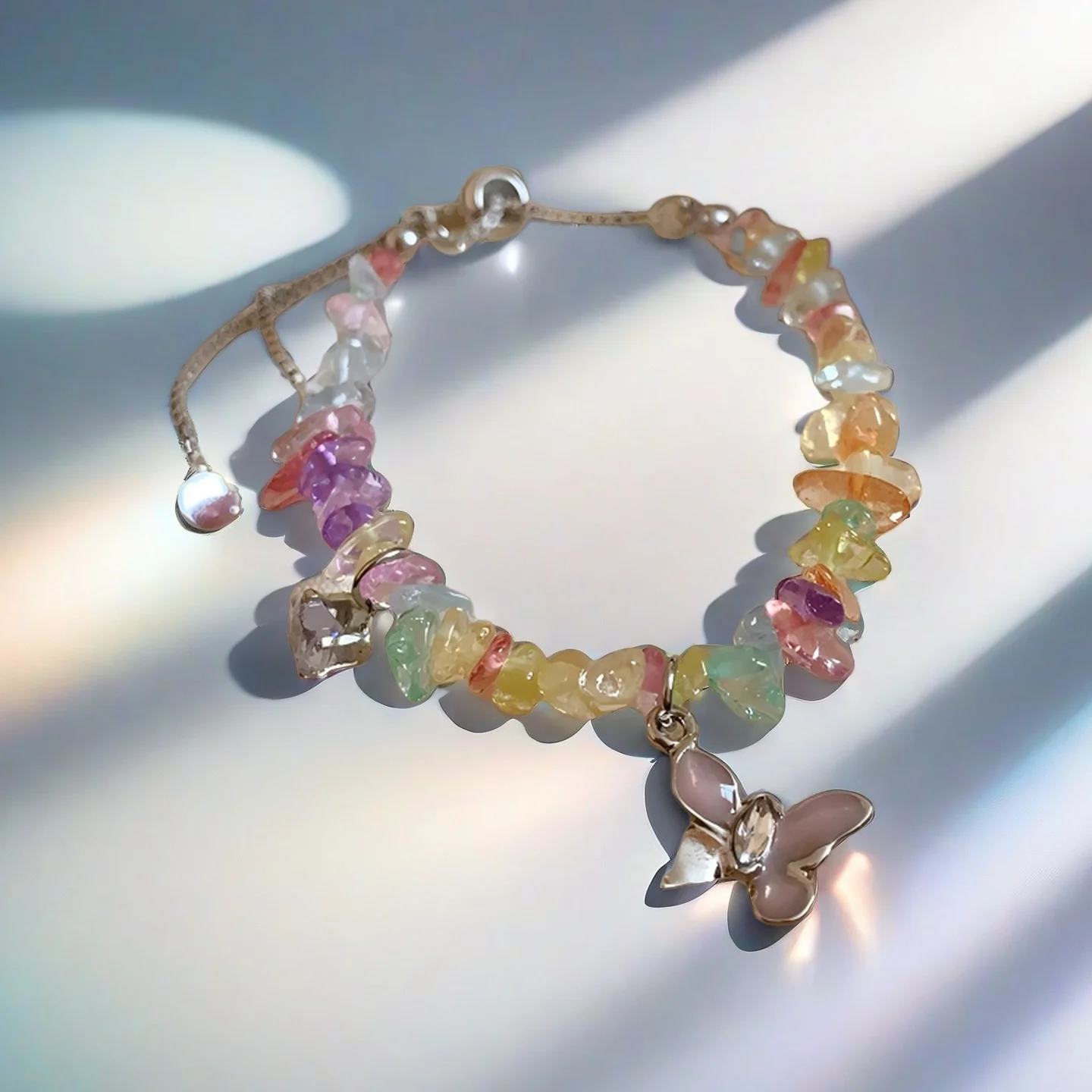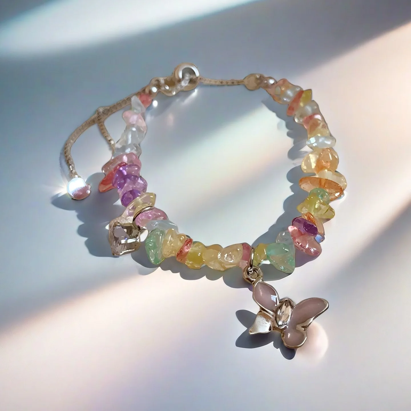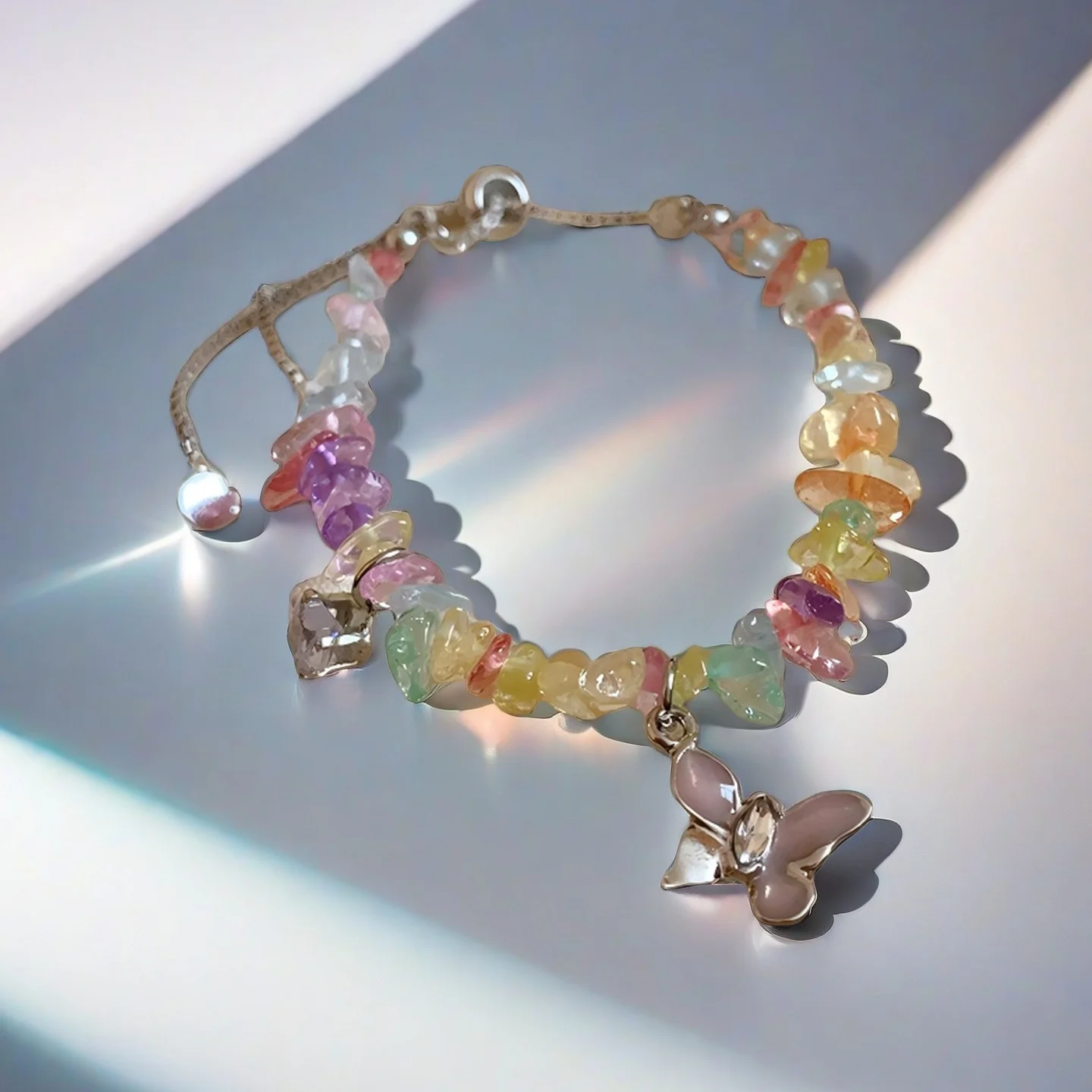 Colorful Natural Stone Chip Bracelet with Butterfly Charm Adjustable Crystal Beaded Bracelet for Women Bohemian Jewelry