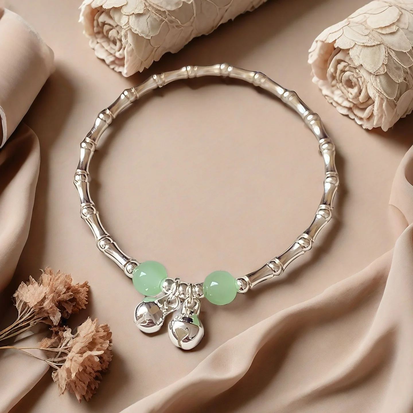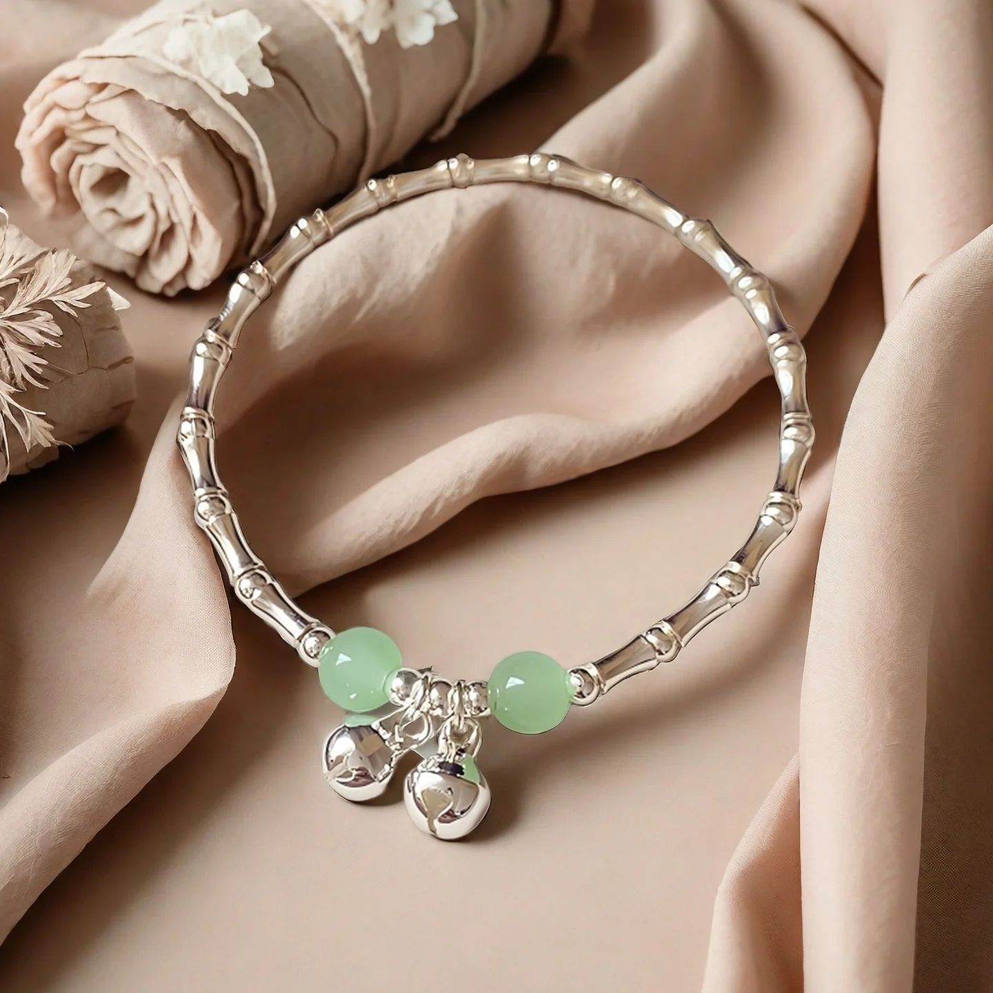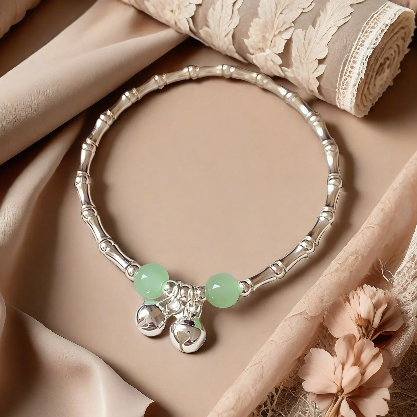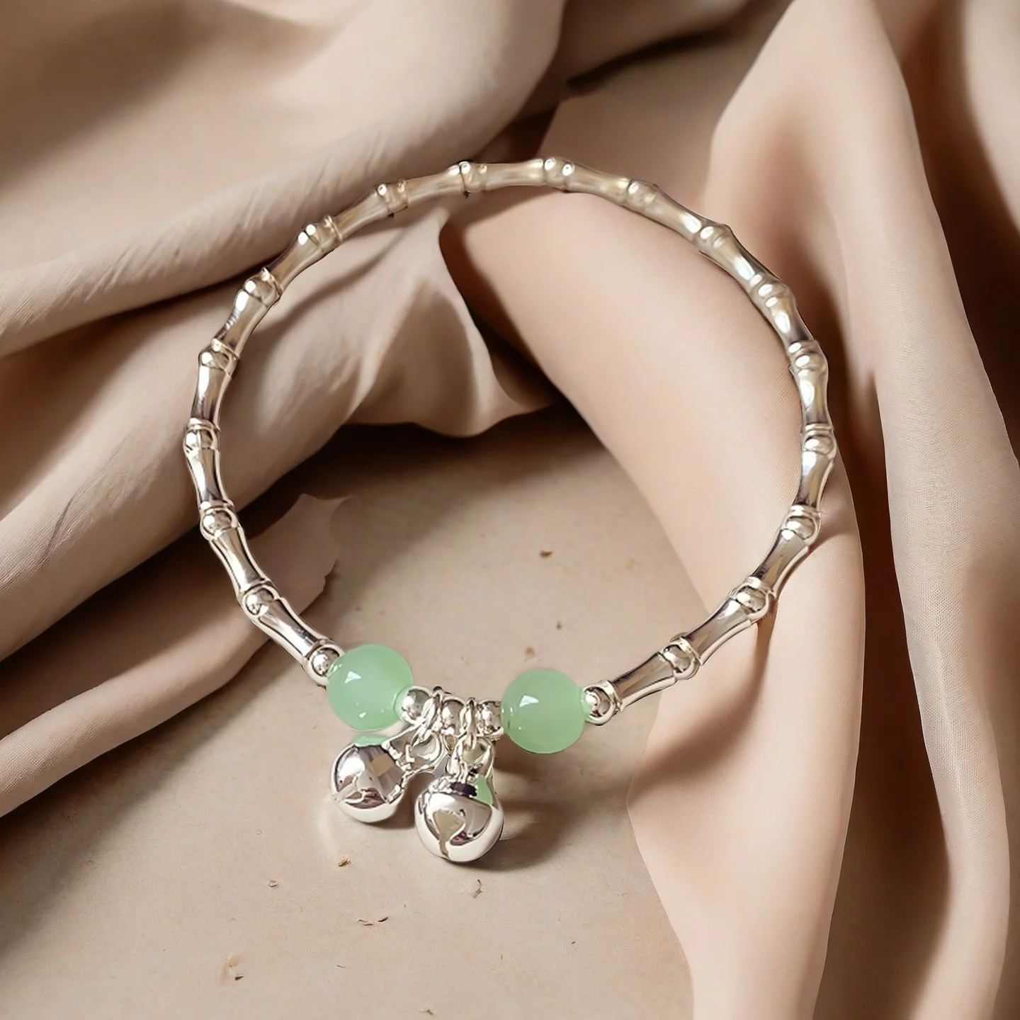 Silver Plated Shaped Bracelet with Green Beads and Bell Charms Elegant Chinese Style Bracelet for Women Fashion Jewelry