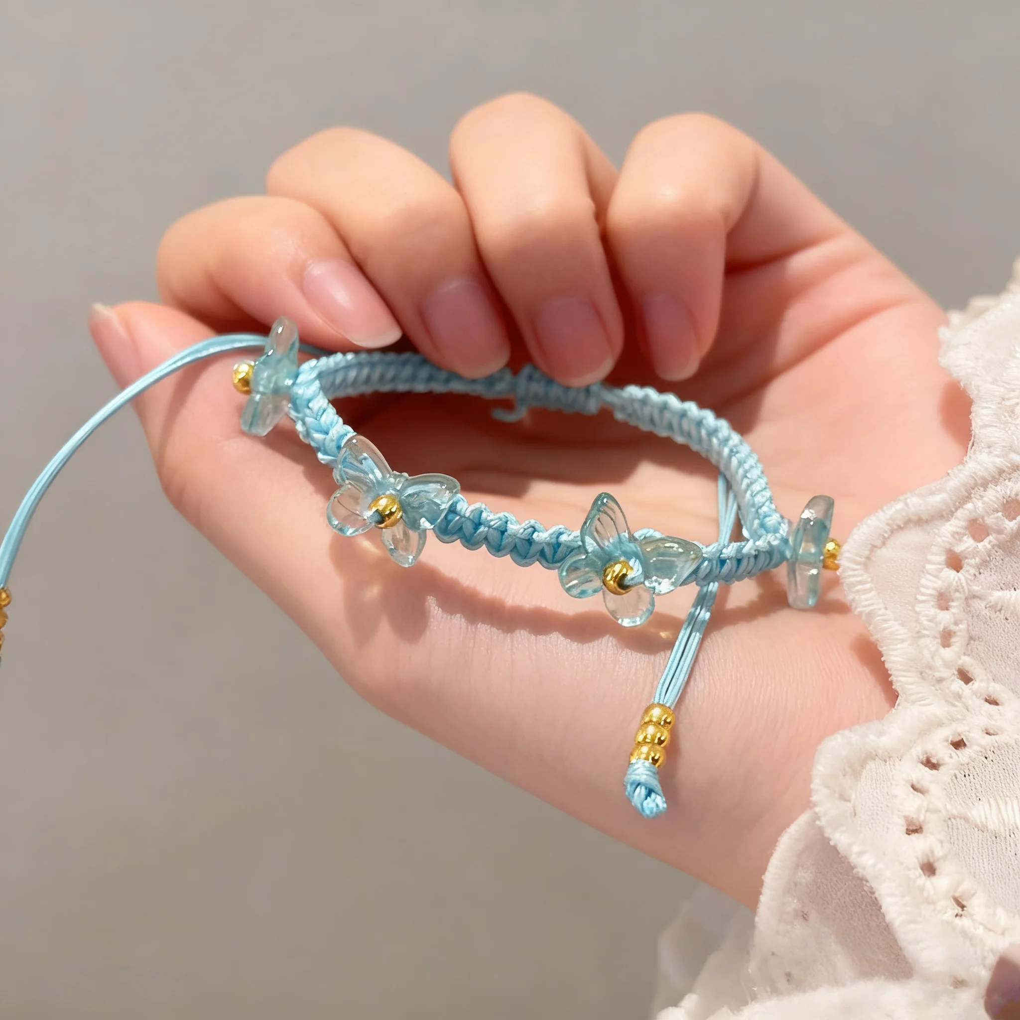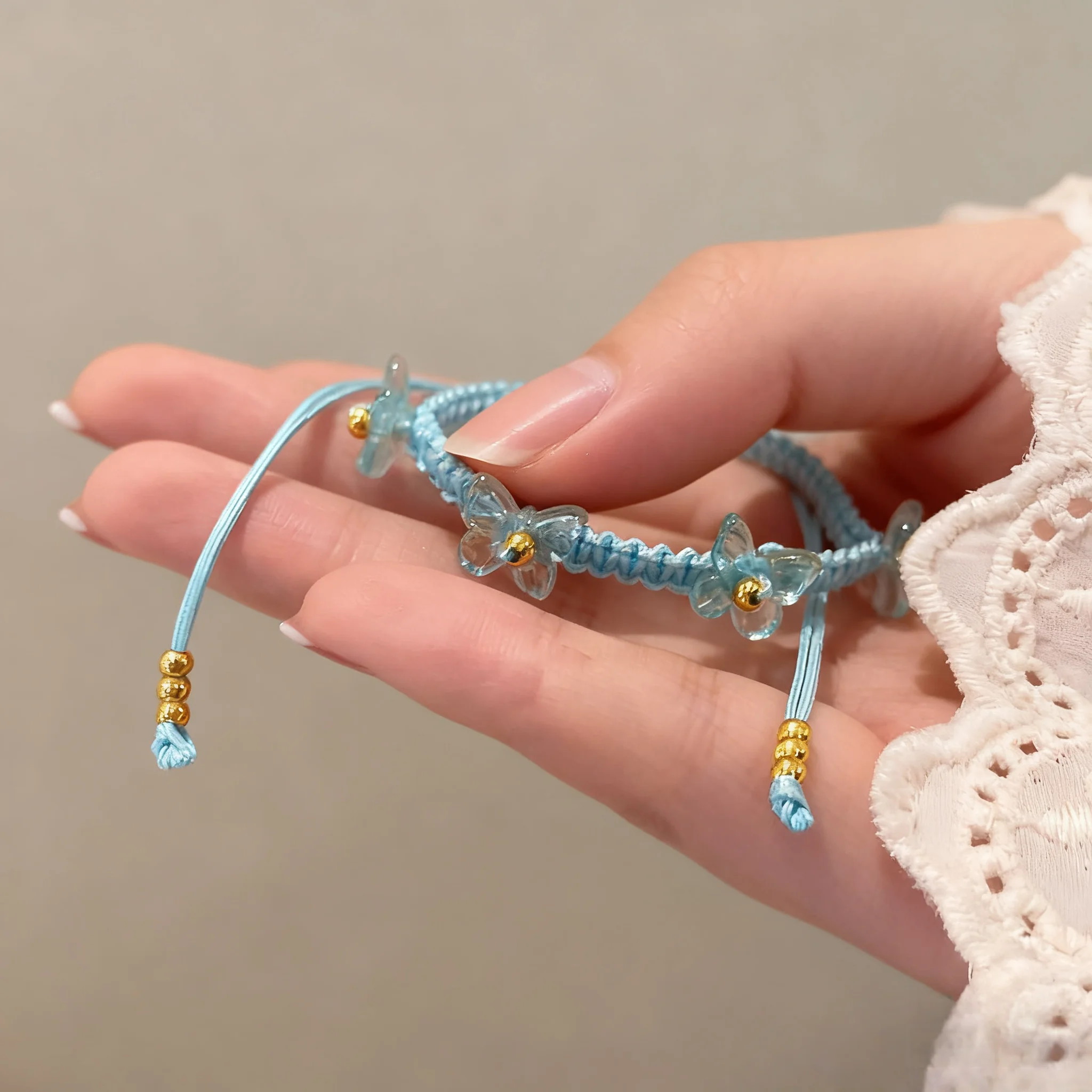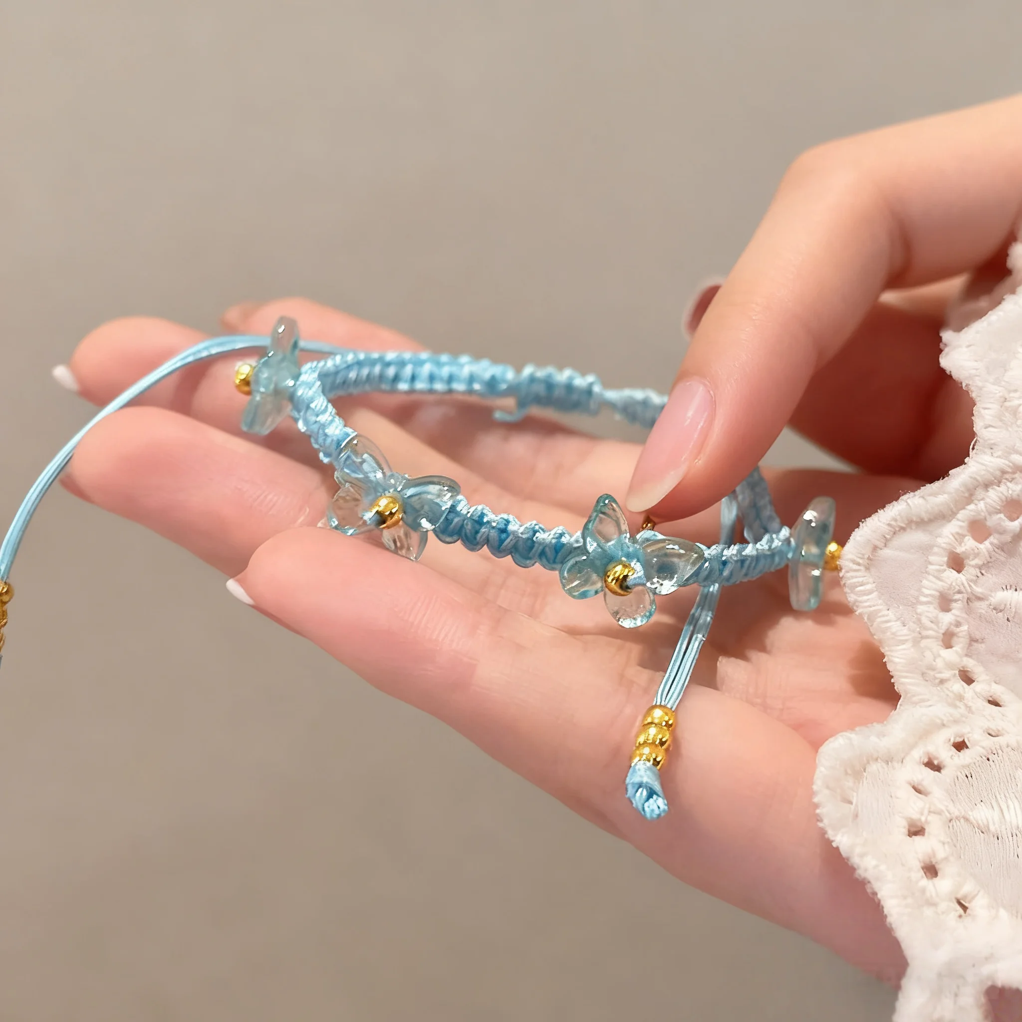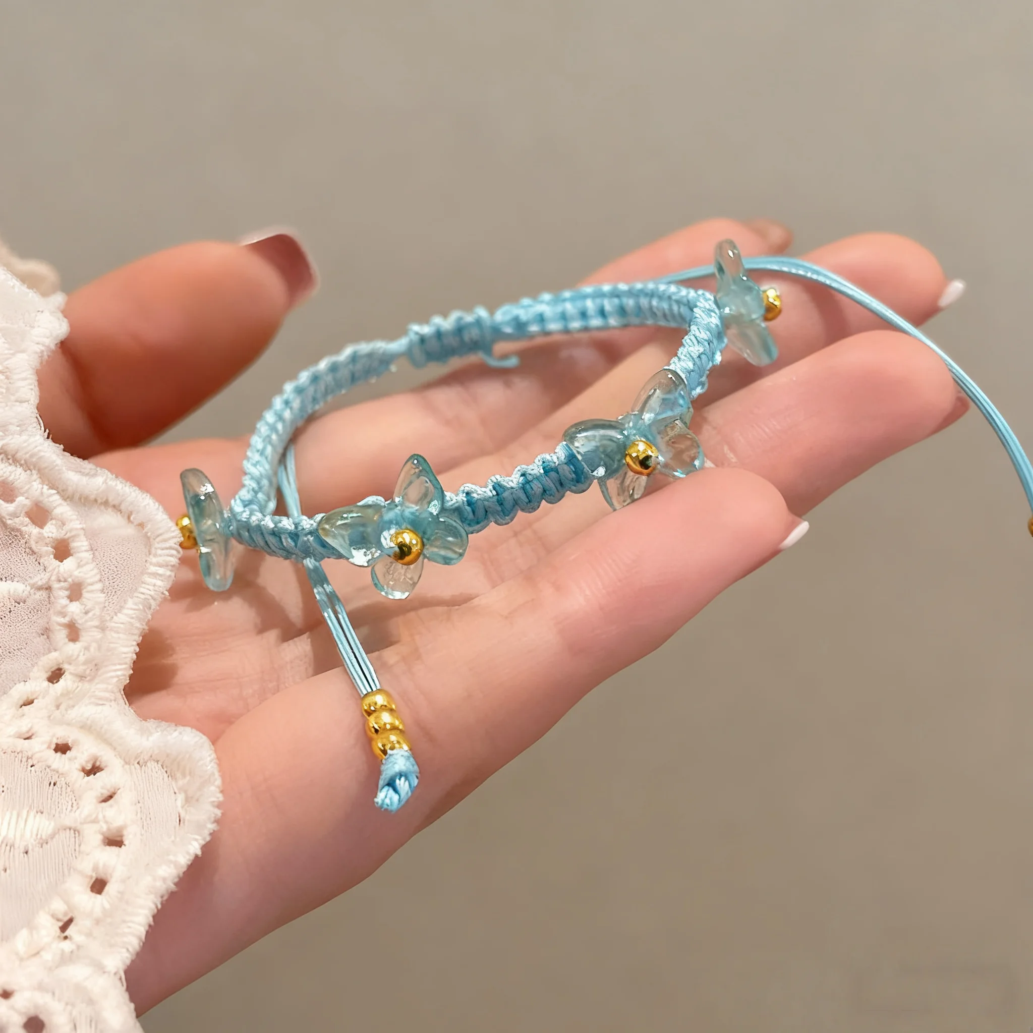 Blue Handmade Braided Bracelet with Transparent Flower Charm and Gold Beads Elegant Fashionable Jewelry Women Daily Wear Gift